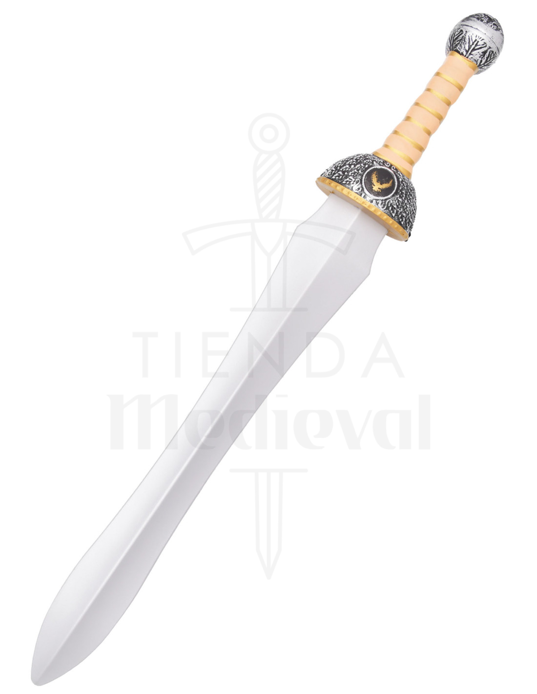 A guarda redonda com textura trabalhada e borda dourada, finalizada por um adorno central e um pomo esférico prateado com gravação, transmite aquele selo clássico romano que eleva qualquer personagem. Esse detalhe visual permite agregar credibilidade ao seu papel, seja liderando legiões, comandando da retaguarda, ou buscando a aclamação do público na arena.