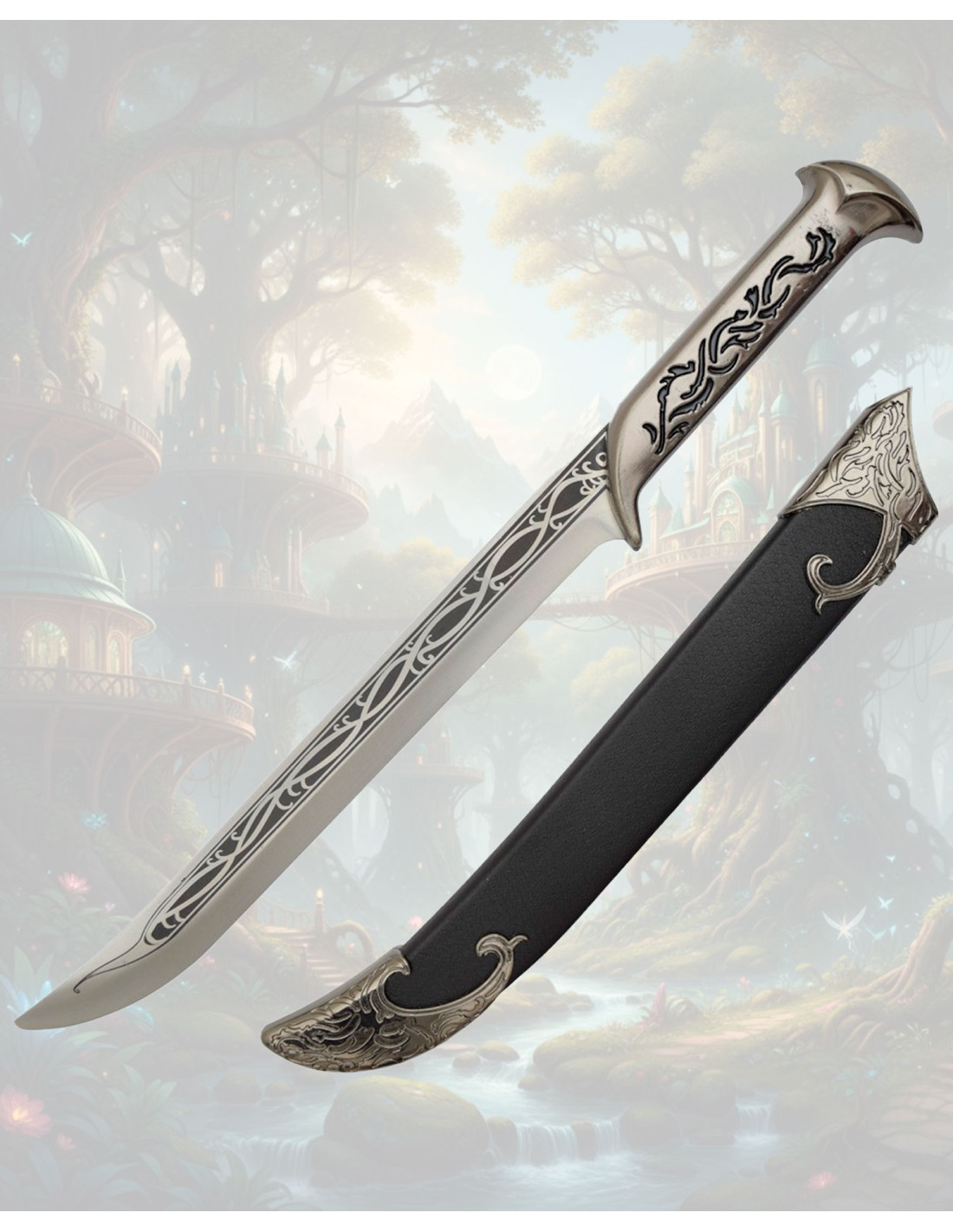 Esta espada curta decorativa não oficial de Thranduil - O Hobbit oferece um acabamento que recria a sofisticação do palácio élfico, tornando-se o centro das atenções tanto para colecionadores quanto para amantes da saga. A lâmina prateada, adornada com motivos curvilíneos em tom escuro, proporciona um aspecto brilhante e elaborado, perfeito para exposição sem abrir mão de uma aparência realista e evocativa.
