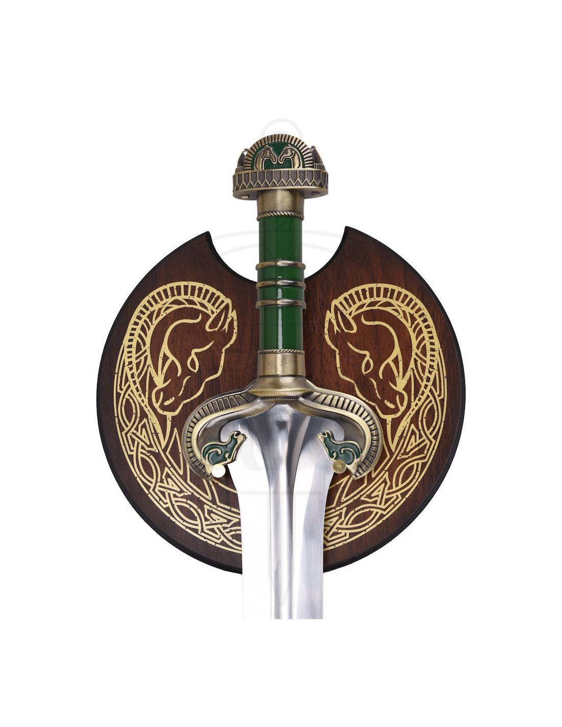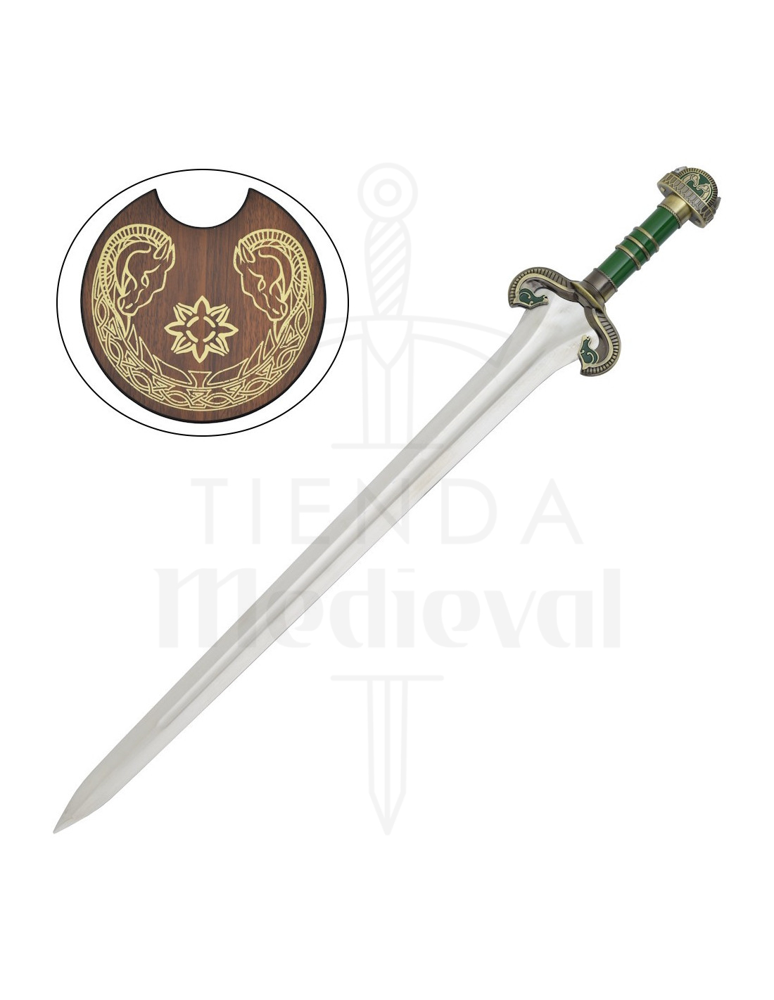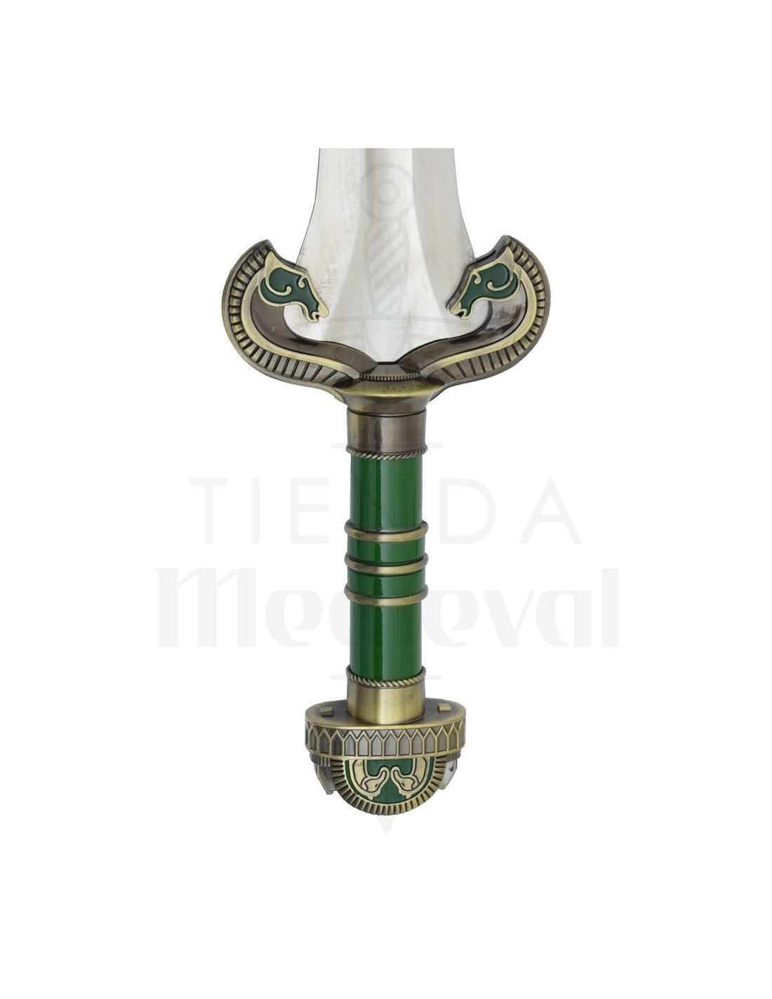 Esta reprodução homenageia um momento heroico, oferecendo uma lâmina metálica polida de fio duplo que reflete a luz com caráter, e uma canaladura central que reforça seu aspecto autêntico e traz uma sensação de equilíbrio ao exibi-la. A empunhadura, em tom verde com detalhes metálicos dourados, proporciona um contraste refinado que transforma a peça em um ponto focal, enquanto a guarda e o pomo arredondado, decorados com motivos estilizados, transmitem uma estética cuidada que evoca nobreza e determinação.