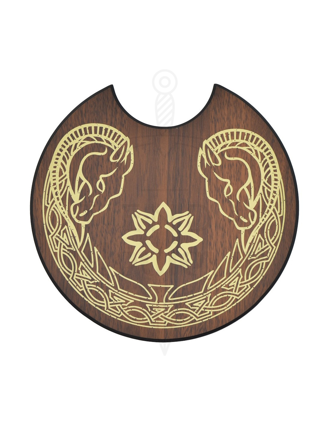 O suporte incluído não é apenas um acessório, é parte do conjunto: madeira escura com acabamento fino e adornos dourados, duas cabeças opostas e um motivo central em forma de estrela ou flor, que sustenta a peça verticalmente e a transforma em um elemento decorativo impactante. Colocar a espada em seu suporte é simples, e o conjunto ganha presença sem necessidade de montagem complexa.