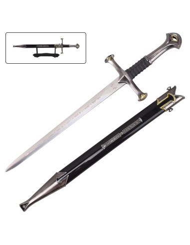 Aragorn, como figura central da franquia, simboliza liderança e legado, valores que se refletem no design desta mini espada, pensada para quem aprecia a conexão com esse universo e deseja uma peça que combine estética e presença em sua coleção.