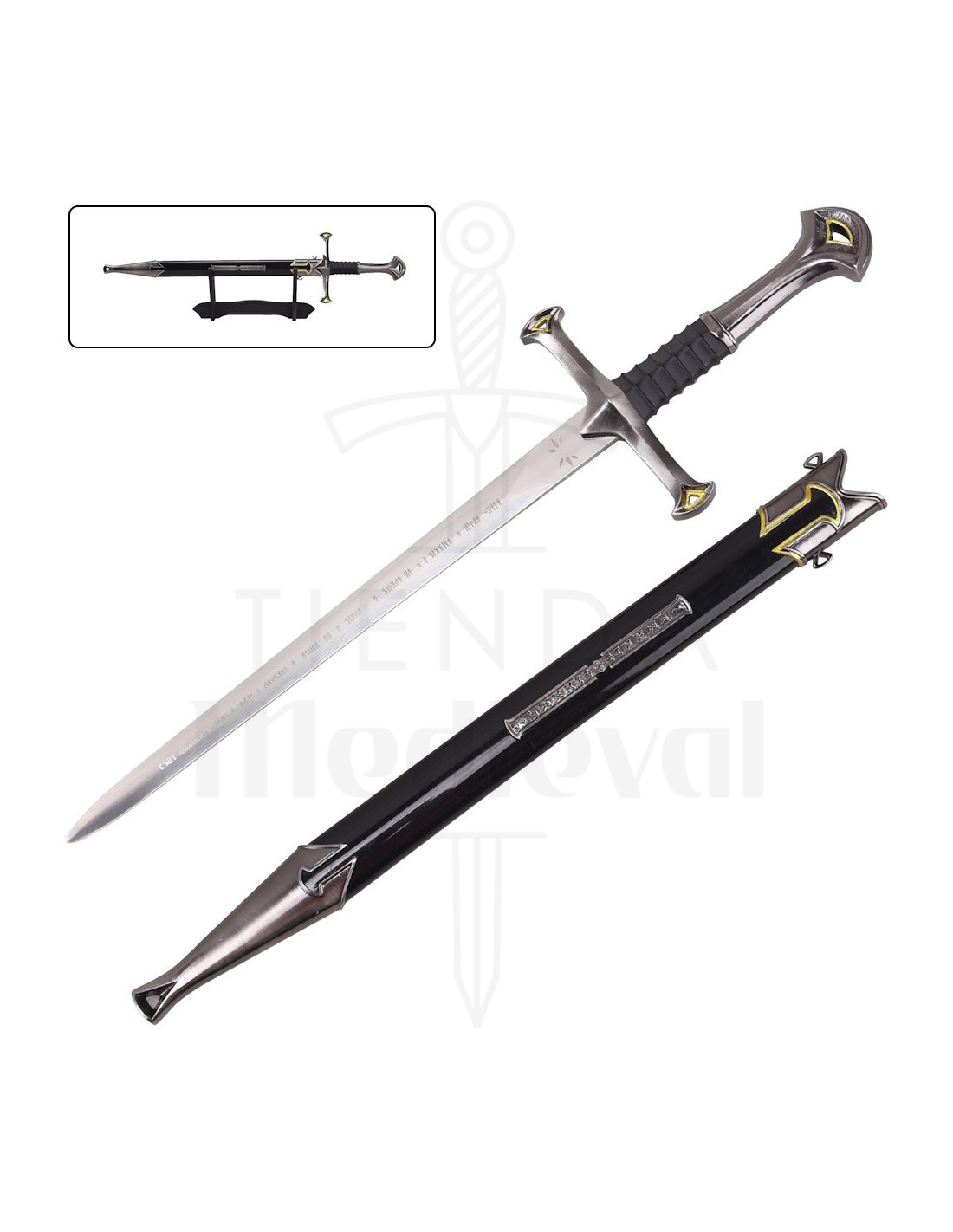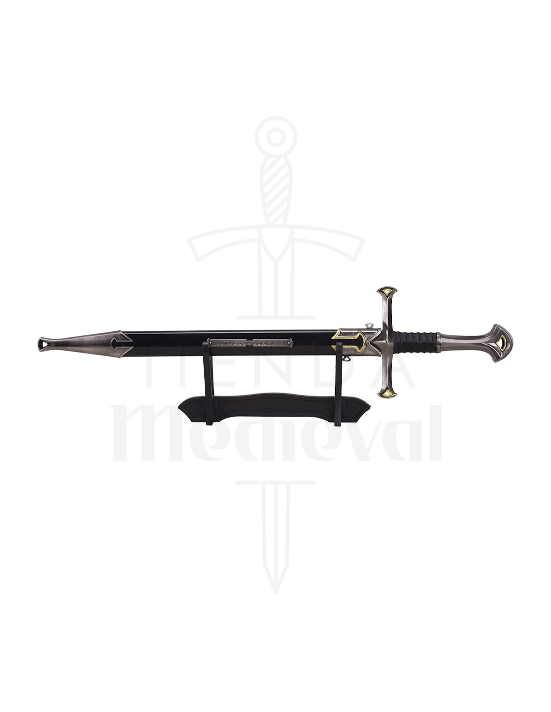 A bainha, com seu protetor final decorativo, e o suporte incluído facilitam a apresentação imediata: coloque a espada sobre a base para conseguir um centro de atenção em qualquer canto, sem necessidade de acessórios adicionais. É uma solução prática para colecionadores e amantes da decoração que valorizam ter peças prontas para serem exibidas.