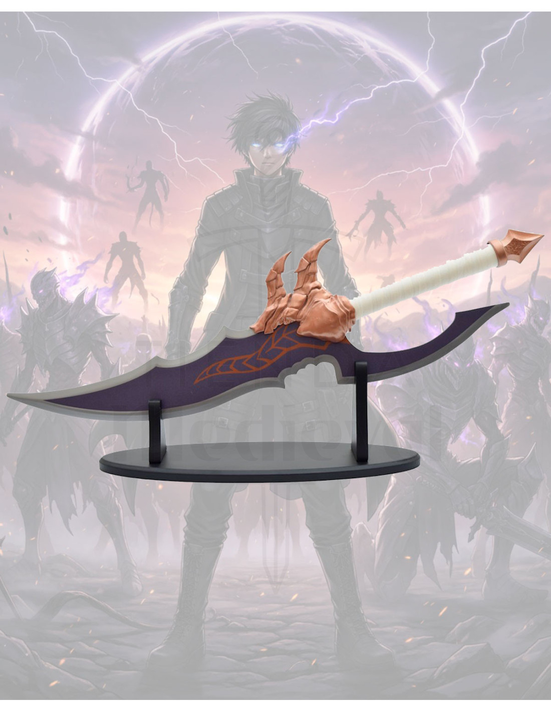 O design recria a estética distinta da arma de Sung Jinwoo, com acabamentos cobre e escuros que contrastam com uma lâmina brilhante, criando um efeito visual que se destaca tanto de frente quanto em detalhes. A seção próxima ao punho exibe relevos que evocam garras e espinhas, conferindo um caráter agressivo e elegante ao mesmo tempo, enquanto o punho envolto facilita o manuseio para exibi-la com confiança.