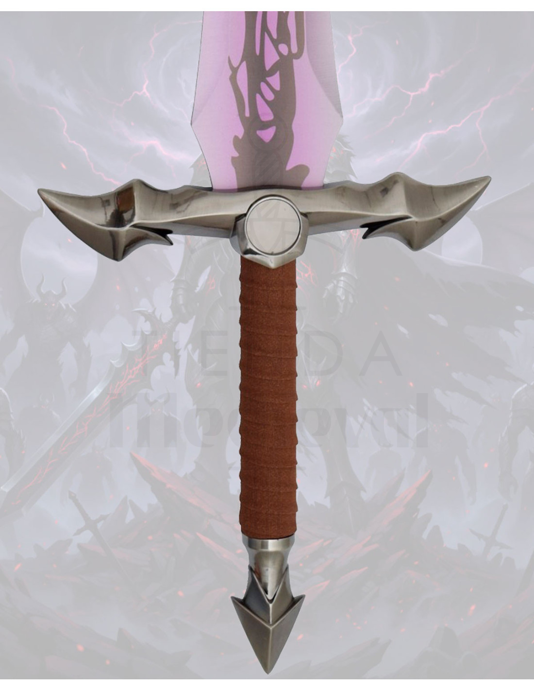 Inspirada na espada do Rei Demônio Sung Jinwoo, uma das figuras mais reconhecíveis do fenômeno Solo Leveling, esta réplica não oficial evoca essa estética poderosa e misteriosa, funcionando como o centro de gravidade visual ideal para sua coleção. Sua lâmina apresenta um padrão decorativo em tons escuros sobre um fundo lilás profundo, criando um contraste que transmite drama e sofisticação, enquanto a ponta afiada e o fio reto mantêm uma linha visual contundente.