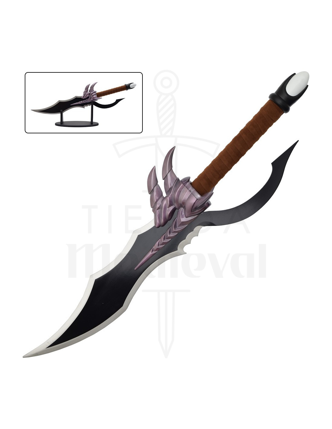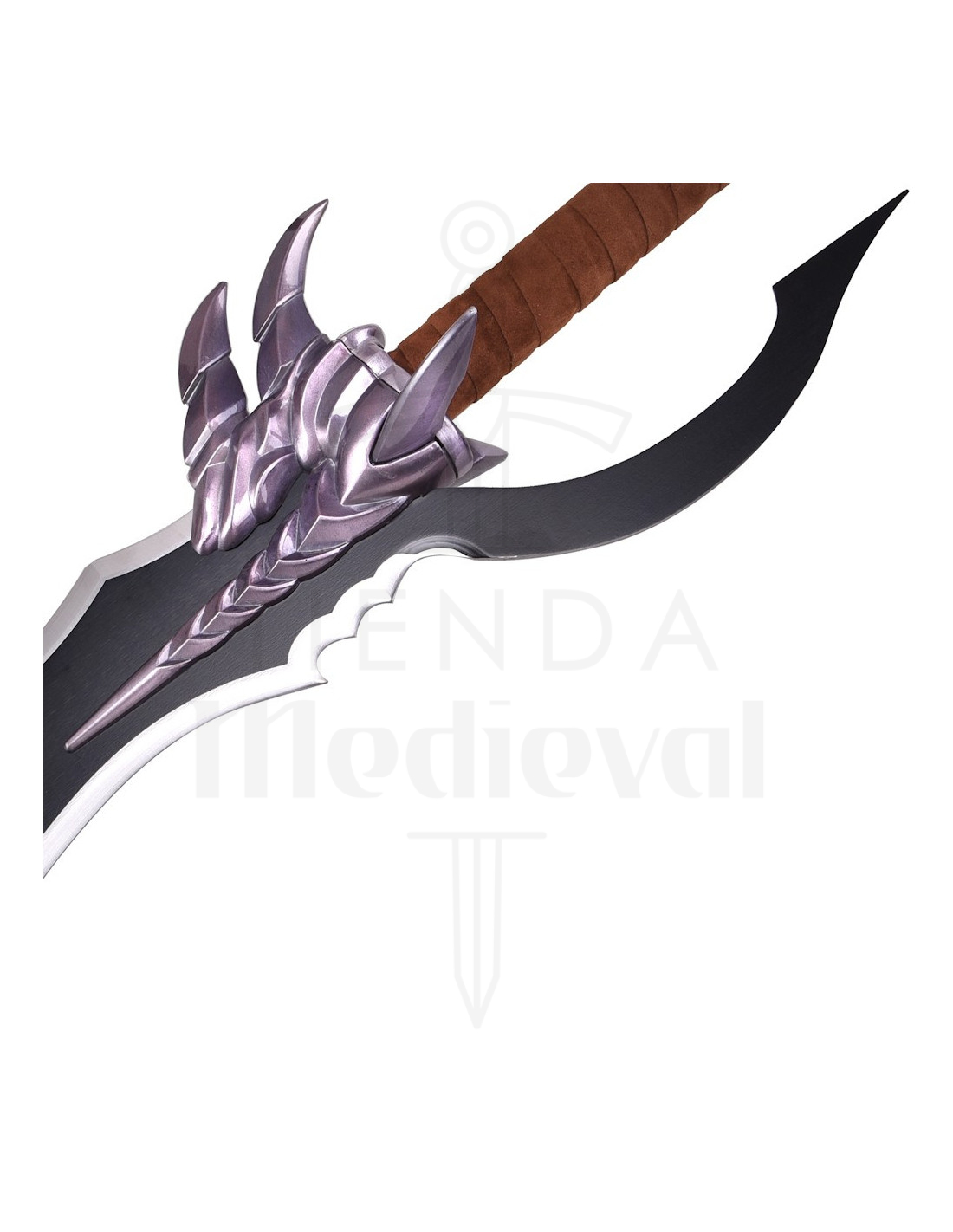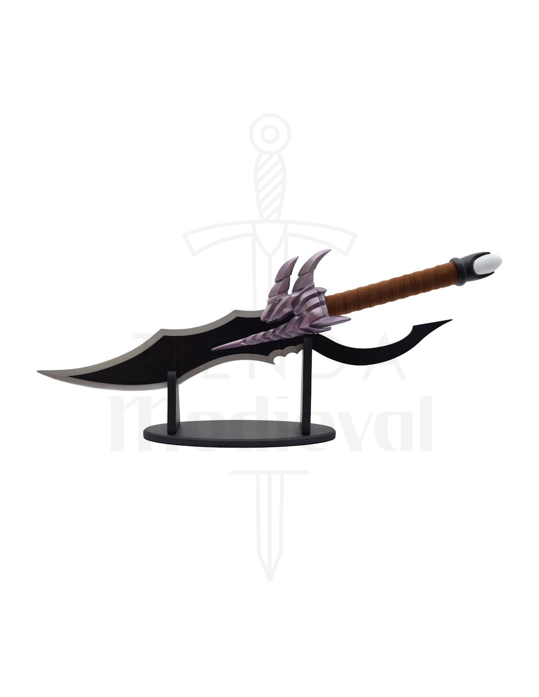 O cabo, envolto em uma fita marrom que aprimora a pegada, e o pomo branco com base preta, oferecem uma sensação de autenticidade e equilíbrio ao segurá-la para colocá-la em seu suporte. A curvatura única na base da lâmina acrescenta personalidade, transformando a peça em algo mais do que um objeto: é uma narrativa visual.