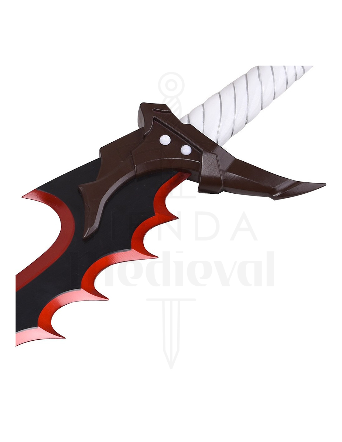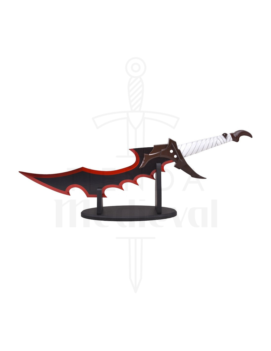 A Réplique de Dague Sung Jinwoo Solo Leveling com suporte traz essa aura dramática graças à sua lâmina negra com bordas vermelhas e um fio irregular cheio de entalhes e pontas, criando um acabamento agressivo e teatral que se destaca sobre qualquer móvel.