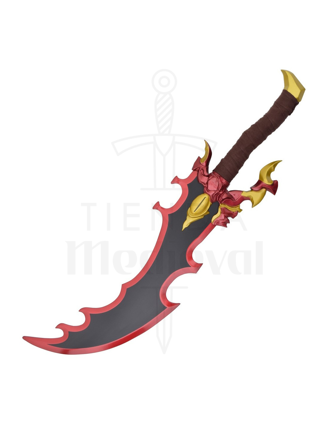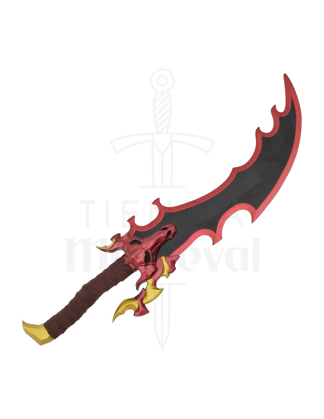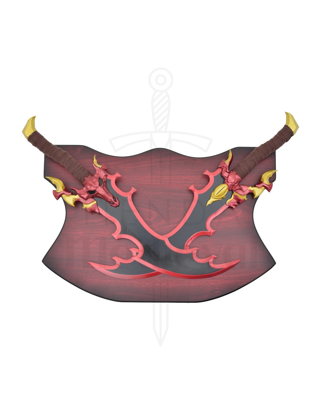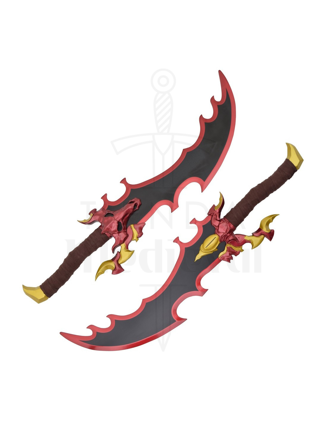 As empunhaduras, envoltas em uma tecido em tom marrom, oferecem uma pegada confortável e uma sensação autêntica ao toque, ideal para manipular durante sessões fotográficas ou para colocá-las com facilidade. As guarda-mão em vermelho com detalhes dourados, e a figura com forma de cabeça de criatura em uma delas, agregam carácter e um ar mitológico, transmitindo uma personalidade própria que conecta com narrativas de poder e mistério.