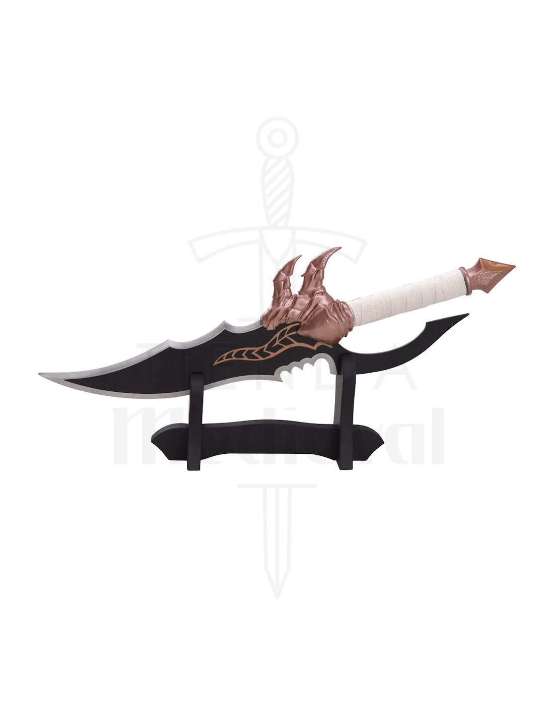 A sensação de solidez é percebida desde a guarda com formato de garras até o pomo pontiagudo, transmitindo uma estética de criatura mítica que amplifica o caráter decorativo. O cabo envolto em corda clara proporciona um agarre texturizado, facilitando sua manuseio ocasional e adicionando contraste visual com os tons metálicos.