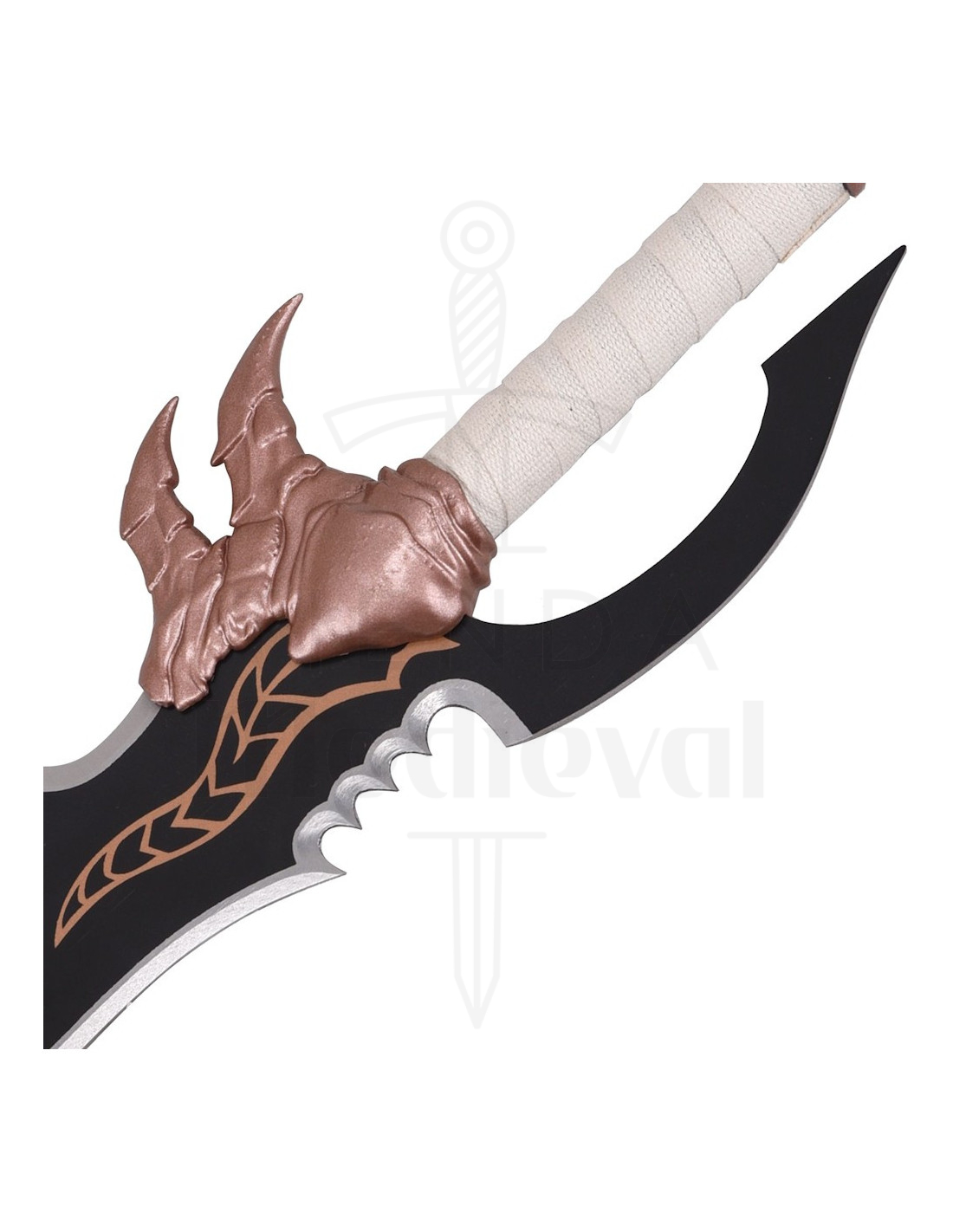 O design irregular da lâmina, com bordas onduladas e serrilhadas, oferece uma aparência agressiva que parece ter saído de uma cena épica. Esse acabamento negro com toques de cobre dá profundidade visual, fazendo com que cada ângulo revele novos detalhes, perfeito para quem busca uma peça de coleção que se destaque sem esforço.