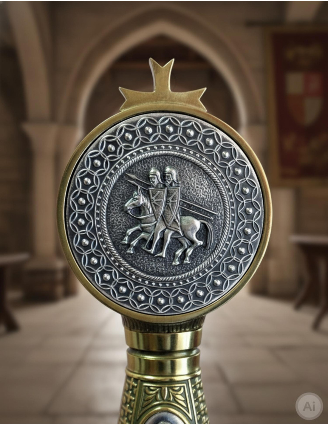 Descubra a espetacular espada Templária decorada! Com 125 centímetros de comprimento, esta espada Toledano Steel irá surpreendê-lo com seus acabamentos dourado, prateado e esmaltado. Na maçaneta, você pode ver a impressionante figura dos cavaleiros Templários a cavalo, enquanto no centro da guarda se destaca o desenho da cruz de chute dos Templários. Além disso, a lâmina é decorada com gravuras ácidas, o que lhe confere um toque único e especial.