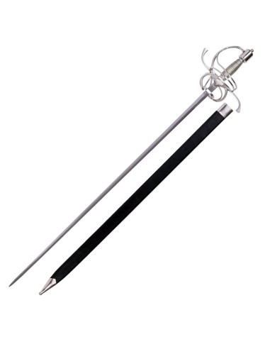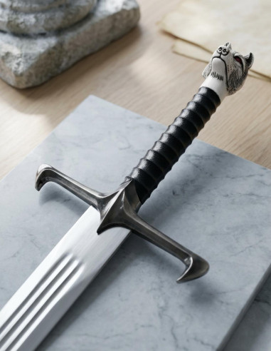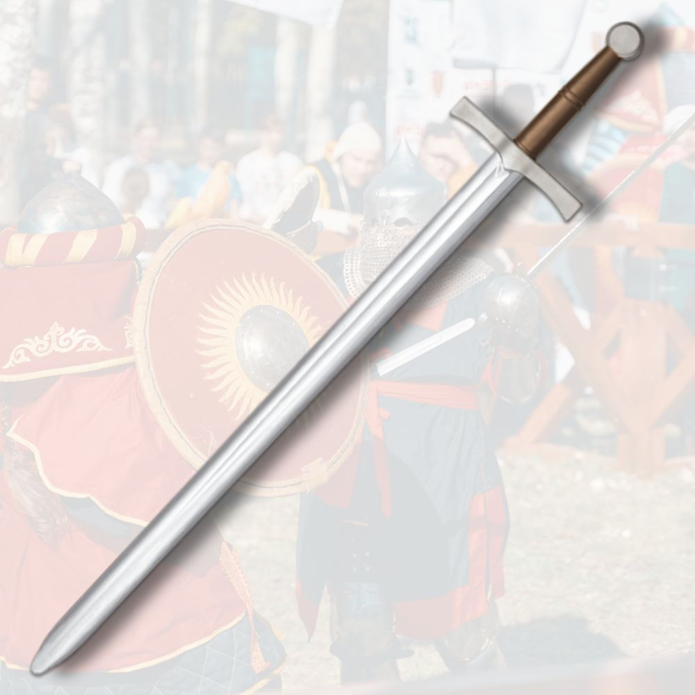 A empunhadura, de design cilíndrico e contornado, garante um agarre confortável e firme. Seu acabamento em tons marrons lhe confere um aspecto clássico e robusto, enquanto o pomo arredondado na parte superior proporciona um equilíbrio excepcional. A guarda reta, em um elegante tom prateado, não só protege suas mãos, mas também complementa o design harmonioso da espada.