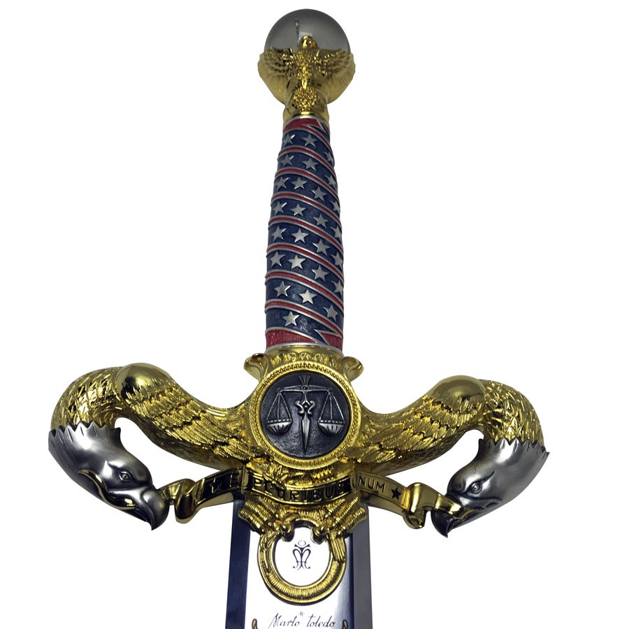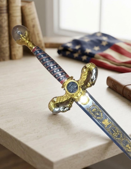 Cada detalhe desta espada, desde a lâmina de aço inoxidável até os símbolos que representam a essência dos Estados Unidos, foi pensado para inspirar e conectar emocionalmente. Com um peso robusto de 3,50 Kg e um design imponente, não é apenas perfeita para colecionadores, mas também para quem quer ter um legado tangível da história em seu espaço.