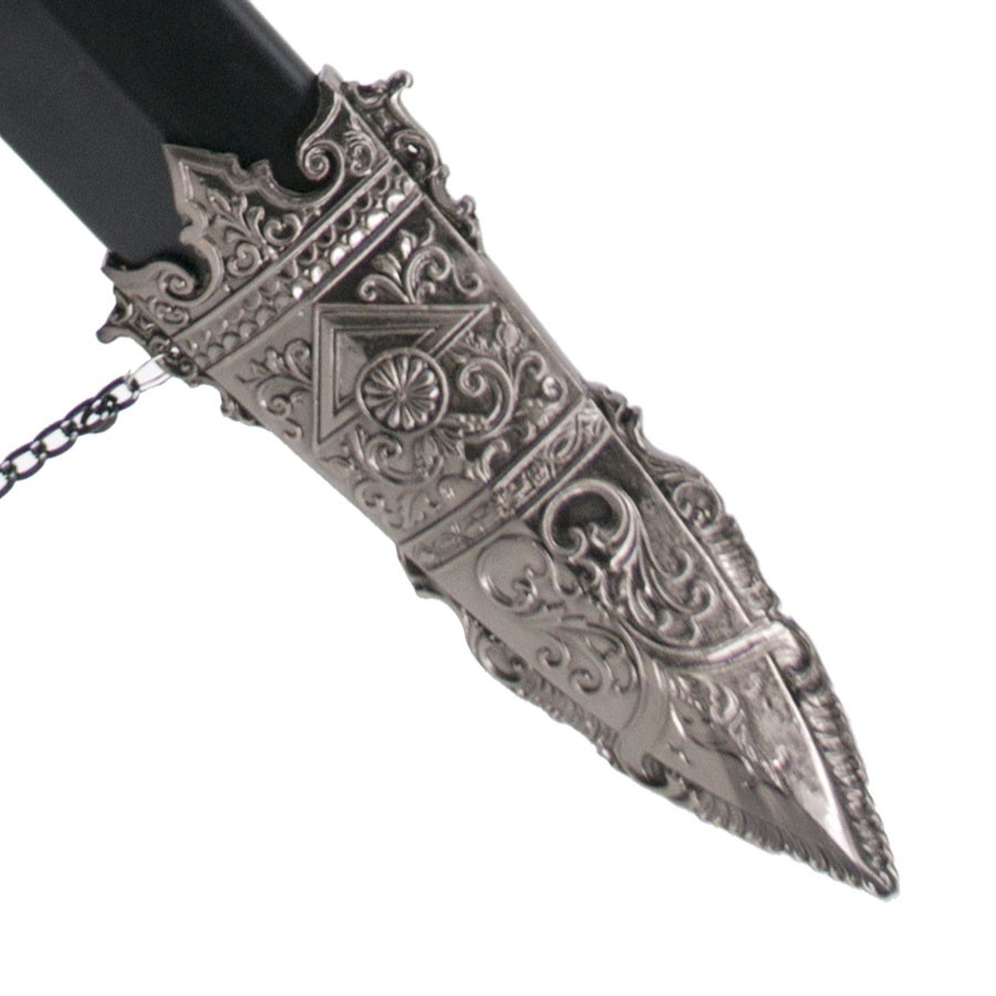Sabre de cavalaria romana, com lâmina em aço e gravuras, guarda e puxador com acabamento em níquel e gravuras. A capa é de cor preta com acabamento em níquel. Inclui suporte de sobre-mesa.