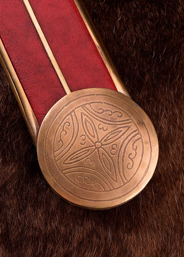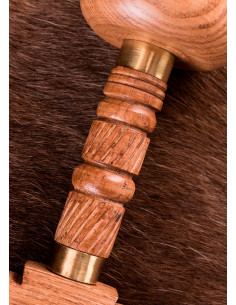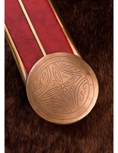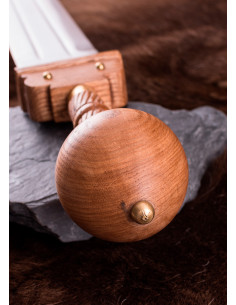 O punho, guarda e pomo de madeira com detalhes decorativos em latão dão um toque de elegância e autenticidade a esta espada romana. Sua alça longa de 21 cm permite uma pegada confortável e firme durante o uso.