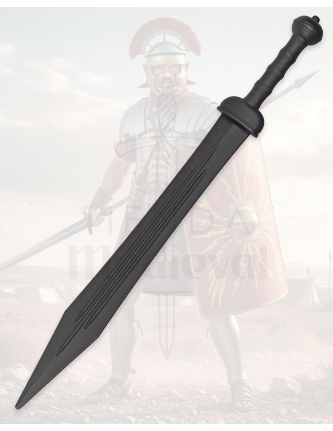 Esta versão preta recria a silhueta clássica com uma lâmina longa, reta e simétrica que inclui dois relevos decorativos, proporcionando aquele aspecto histórico sem abrir mão da segurança. O acabamento em borracha rígida oferece uma presença robusta, permitindo contatos controlados e maior confiança em cada golpe e bloqueio.