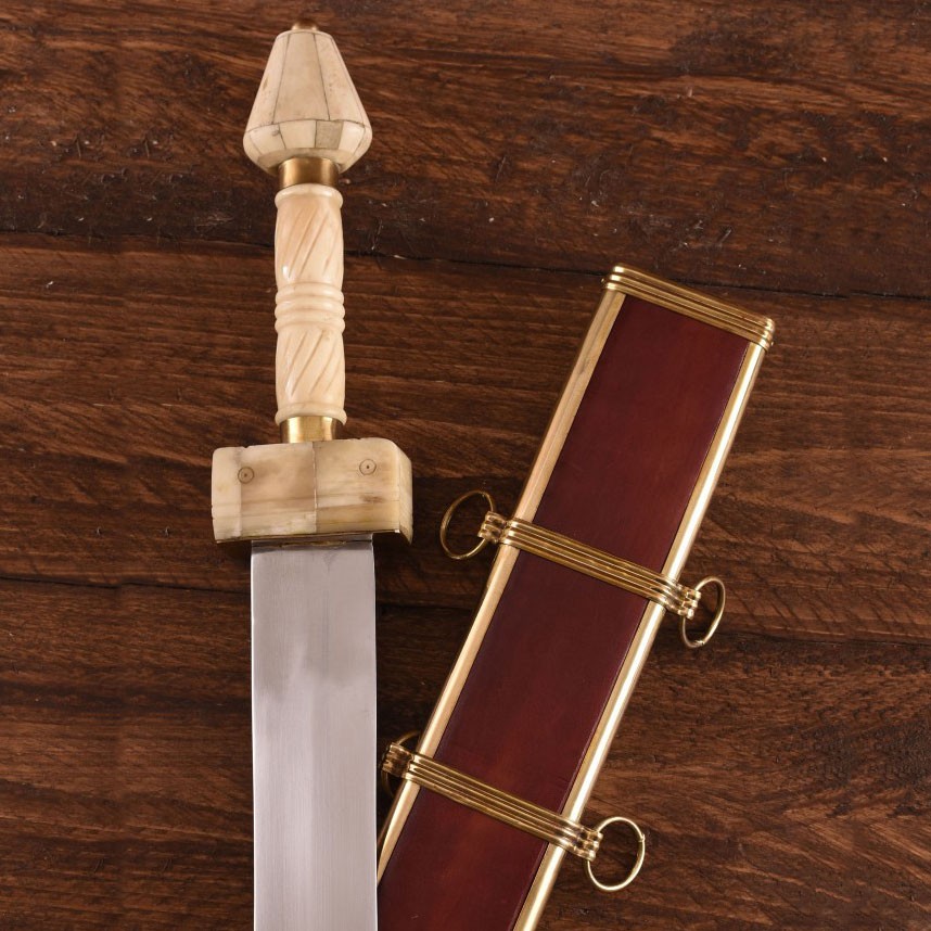 A Spatha Romana é muito mais do que uma simples réplica — é um veículo para projetar a tua força interior, o teu interesse pela história e o teu orgulho pela tradição. Com a sua lâmina de aço carbono, oferece-te durabilidade e resistência que refletem a força que desejas experimentar no teu dia a dia. A empunhadura em osso e latão aporta esse aspecto autêntico, em sintonia com a época, elevando o teu sentimento de pertença e hierarquia. A bainha de madeira remachada, com acabamentos metálicos, não só protege, mas também eleva a estética desta obra-prima. Tê-la nas mãos é sentir a presença de um passado de poder, pronto para te inspirar a afirmar o teu carácter e destacar-te em qualquer espaço que ocupes. A Spatha não se limita a ser uma peça decorativa, é um símbolo da tua determinação, um lembrete de que tu também podes incorporar a força de um guerreiro romano, todos os dias.