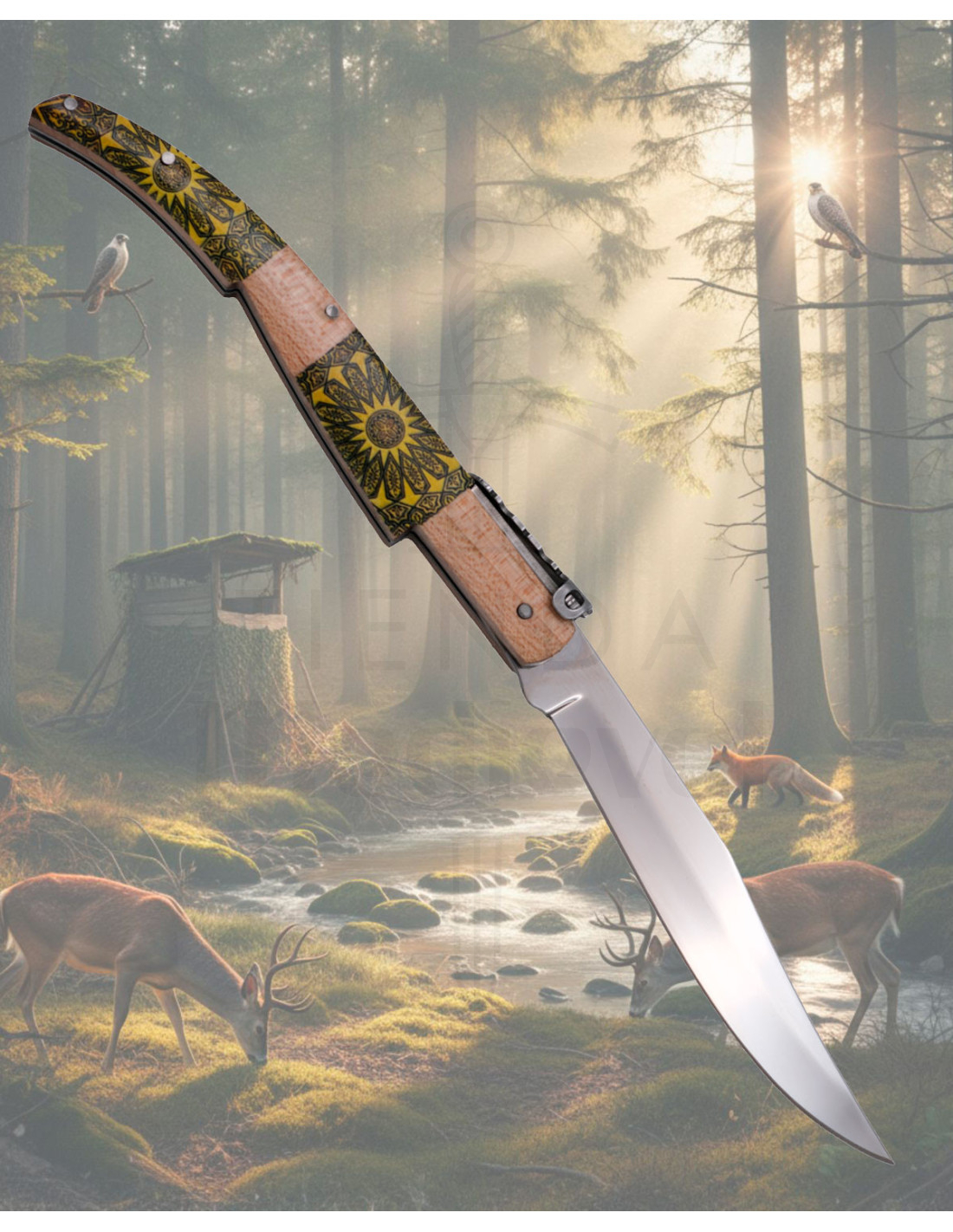 Projetado para quem valoriza tanto a funcionalidade quanto o estilo, este canivete dobrável combina manejo suave com uma presença sofisticada. A empunhadura em madeira Maple oferece uma sensação quente e ergonômica, com áreas lisas que acariciam a mão e seções decoradas em tons dourados com um padrão geométrico tipo mandala que atrai o olhar sem atrapalhar a pegada. A impressão que imita o damasco realça o acabamento, conferindo caráter sem sacrificar a limpeza visual.