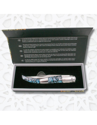 Canivete árabe, tipo catraca, cabo stamina azul, lâmina 9,7 cm.