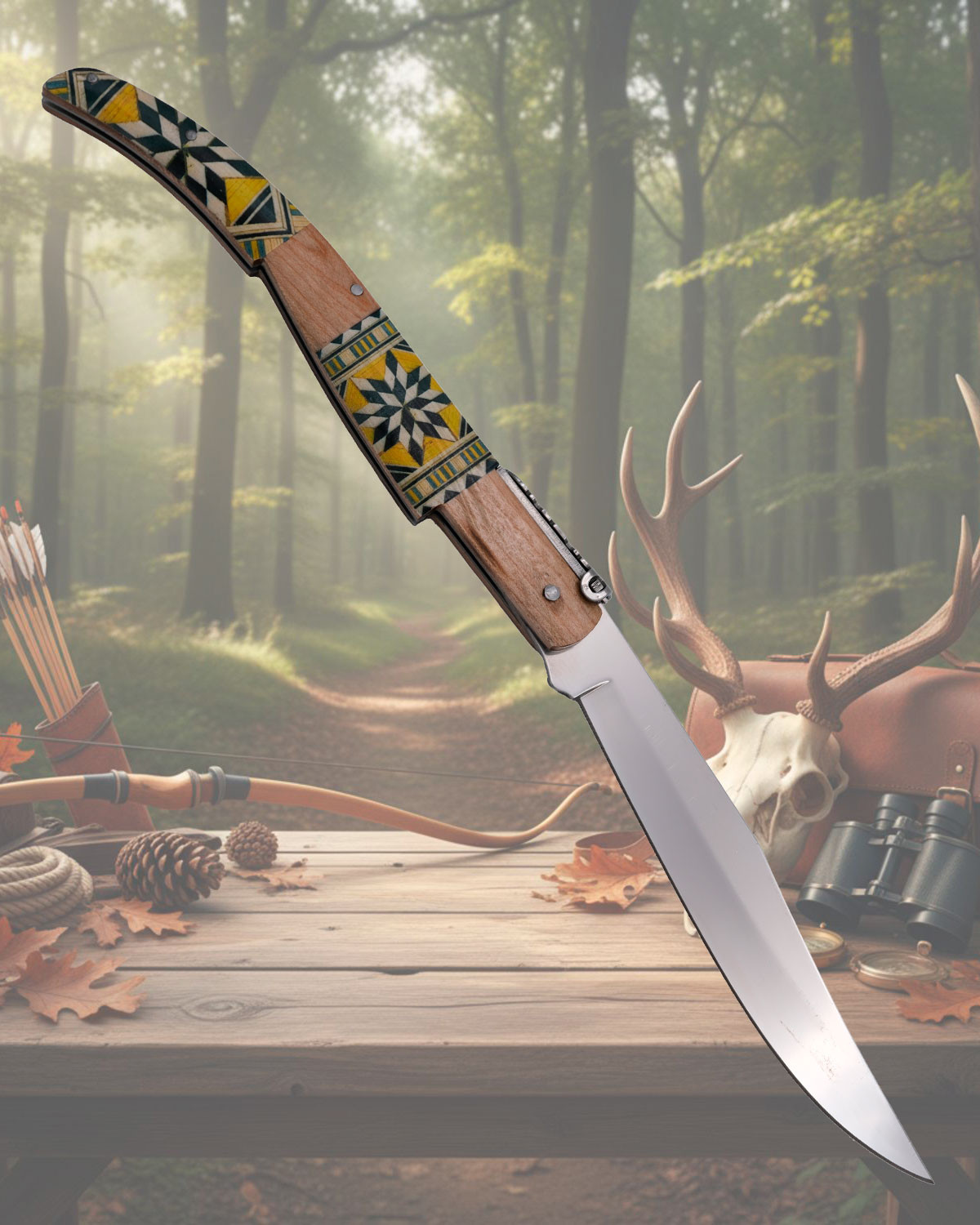 Este modelo apresenta um trabalho realizado com precisão CNC e um acabamento que imita a marchetaria, pensado para quem valoriza a união entre estética e funcionalidade. A empunhadura em madeira Maple combina áreas de tonalidade clara com painéis decorativos em amarelo, preto e bege, criando um contraste atraente que chama a atenção sem perder discrição. A forma curva e ergonômica do cabo facilita uma pegada natural, reduzindo a fadiga e oferecendo controle em cada movimento.