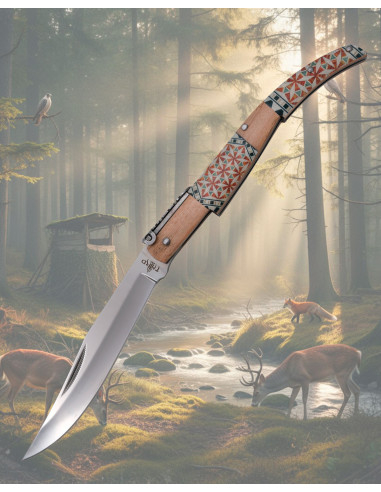 A empunhadura em madeira de Bordo, acabamento suavizado e decorada com padrões geométricos em tons marrons, vermelhos e bege, oferece uma pegada confortável e elegante, que se destaca tanto pelo aspecto ornamental quanto pelo toque tratado. Os rebites metálicos e a palanqueta decorada transmitem solidez e cuidado em cada detalhe, tornando seu uso uma experiência segura e refinada.