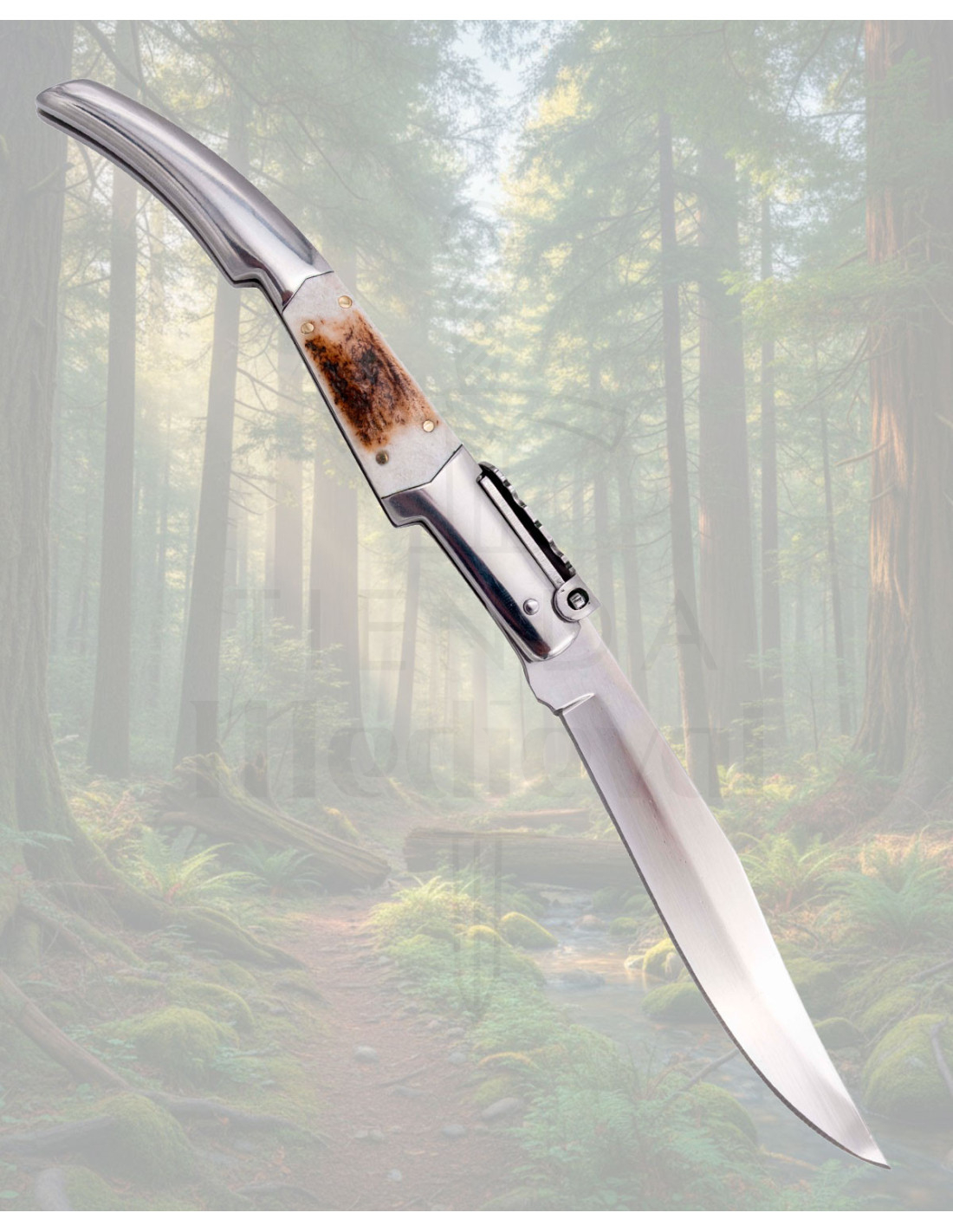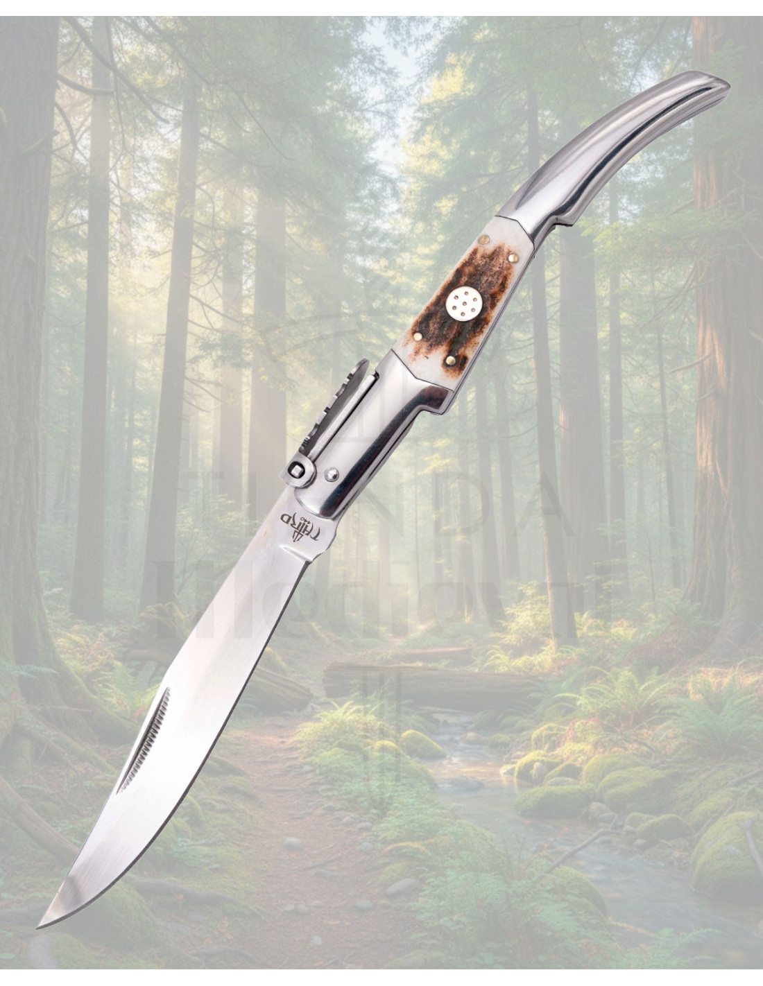 O cabo oferece uma mistura equilibrada entre robustez e calor visual graças às inserções de chifre de cervo autêntico com decoração central, que proporcionam um agarre natural e caráter único em cada peça. As virolas de aço polido e os rebites metálicos reforçam a estrutura, dando uma sensação de qualidade sólida sem abrir mão da elegância clássica.