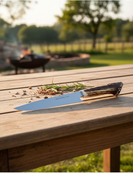 O cabo, elaborado em chifre de cervo proveniente da desova, oferece uma sensação natural e ergonômica, com uma textura rugosa que assegura uma pegada firme mesmo quando as mãos estão úmidas. Este contato próximo torna cada movimento controlado e seguro, sem perder a elegância própria de uma peça artesanal.