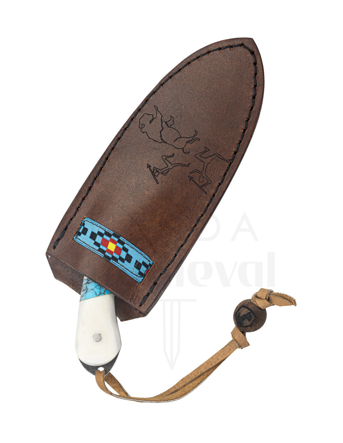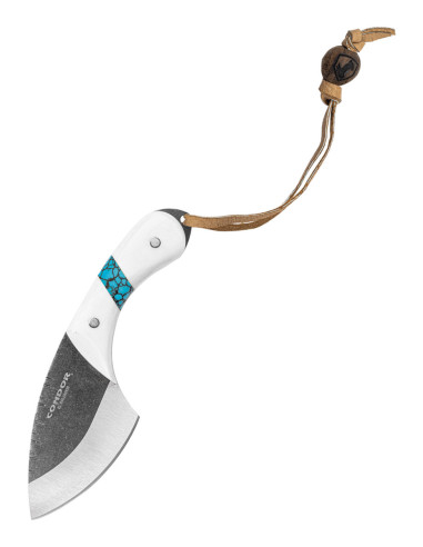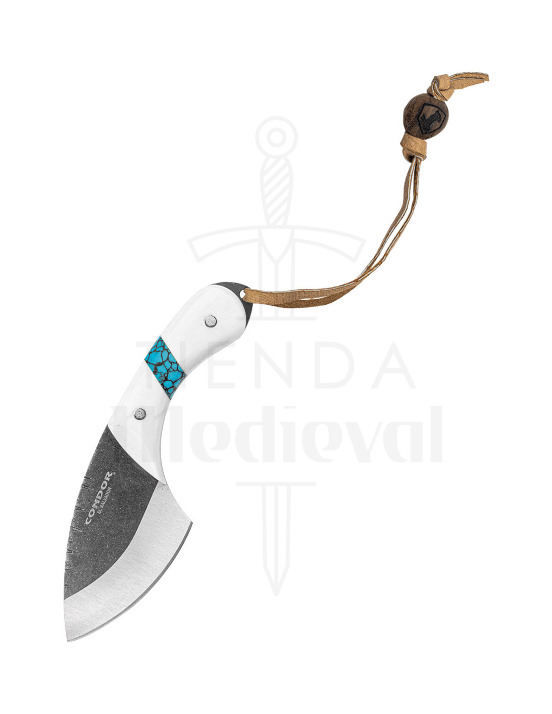 O cabo micarta, preso com dois pinos, não só oferece uma pegada confortável e segura, mas também se destaca pelas incrustações de turquesa reconstituída, evocando o Rio Azul, afluente do Colorado, que dá nome a esta faca. A espiga sobressai cerca de 5 mm do cabo e possui um orifício para o cordão de couro incluído, adornado com uma grande conta de madeira.