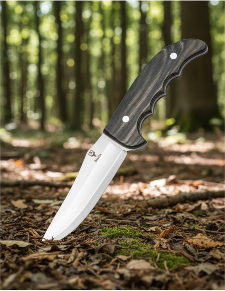 O cabo, confeccionado em madeira prensada evergreen com veios visíveis e polido suave, foi projetado para se ajustar à mão. As muescas para os dedos e a curvatura final permitem uma empunhadura firme e confortável, reduzindo a fadiga em trabalhos prolongados e melhorando a segurança em cortes exigentes. Os rebites metálicos reforçam a união entre lâmina e cabo, transmitindo confiança desde o primeiro agarre.