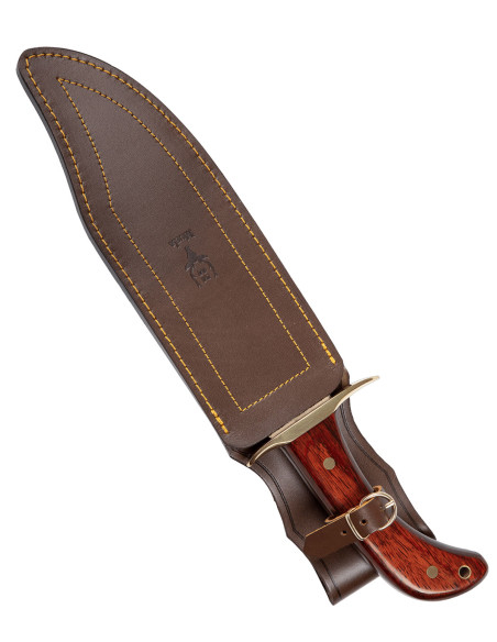 O cabo em madeira prensada palorojo oferece uma superfície lisa e quente ao toque, com veios visíveis que realçam seu caráter natural. Sua forma ergonômica, reforçada por três rebites dourados, garante uma pegada segura e confortável durante longas jornadas, enquanto o orifício final permite segurar a faca ou pendurá-la para acesso rápido.