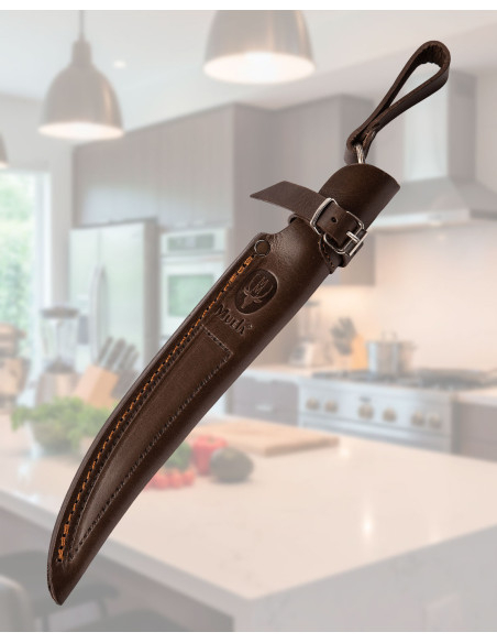 A capa de couro incluída protege a lâmina durante o armazenamento e os deslocamentos, cuidando do fio e evitando danos. É ideal para quem precisa levar sua ferramenta ao trabalho ou mantê-la impecável em casa.