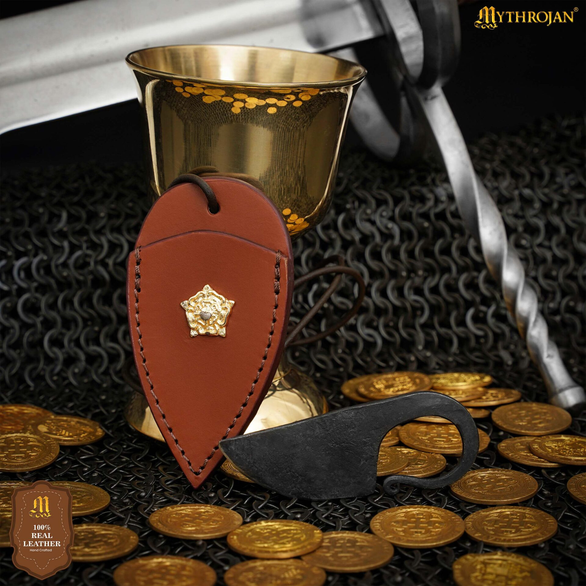 A bainha, trabalhada em couro genuíno, foi tingida e costurada à mão, conferindo um aspecto robusto e refinado ao mesmo tempo. Seu formato em escudo com um impecável emblema dourado em relevo evoca poder e honra medievais, tornando-a uma peça decorativa que também protege a lâmina. O couro rígido e as costuras visíveis reforçam a sensação artesanal e duradoura.