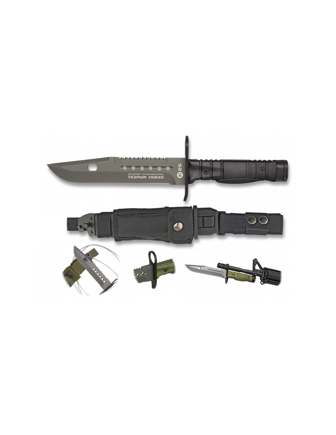 Se você está procurando uma faca tática resistente e durável para suas aventuras radicais, a Faca Tática Bayonet é o que você precisa. Com uma lâmina de aço inoxidável revestida de titânio de 7 polegadas de comprimento e um cabo preto revestido de borracha, esta faca lhe dará um aperto firme e seguro sempre.