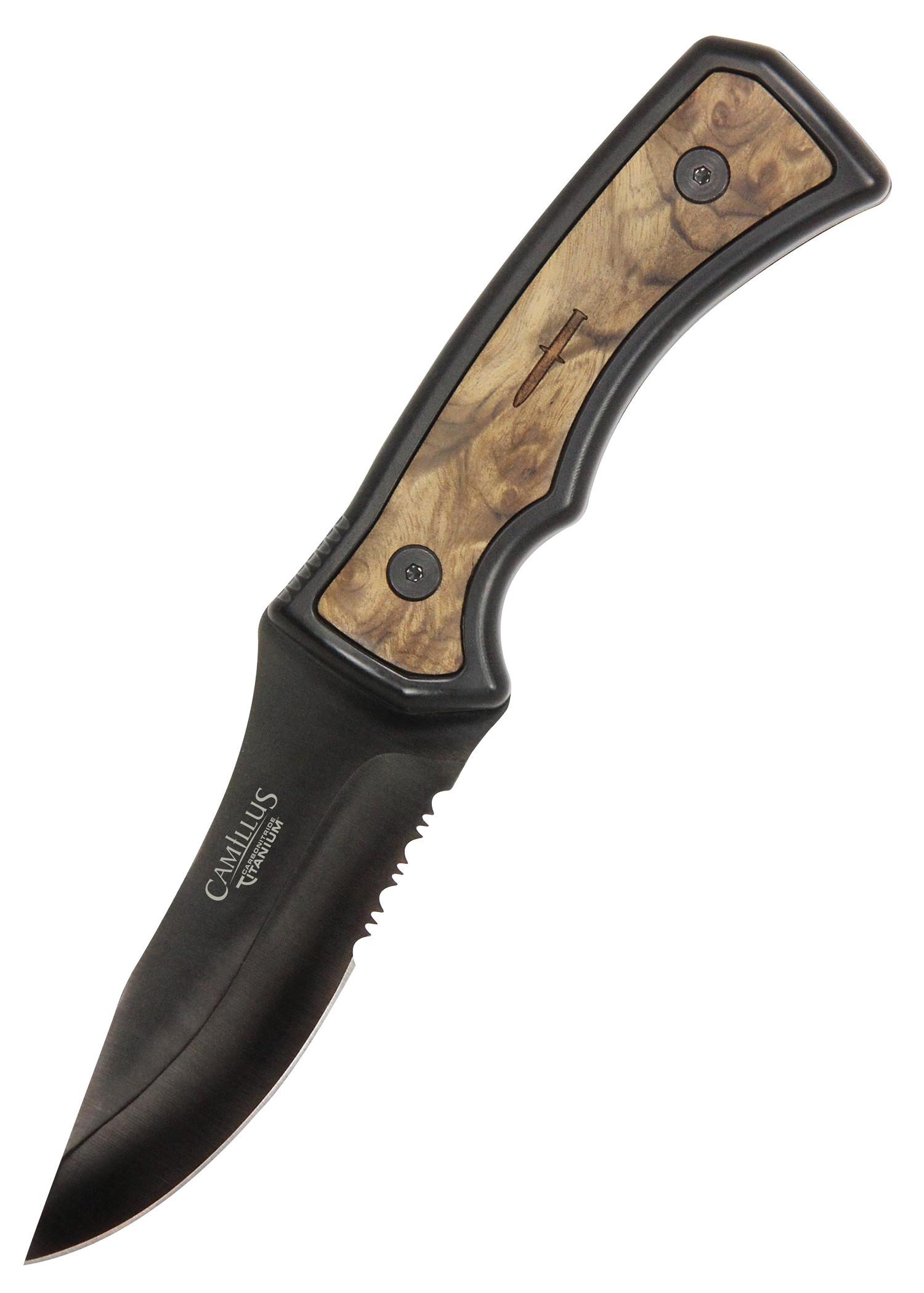 - Cabo ergonômico com detalhes em madeira burl: O cabo é feito de TPE com incrustações em madeira burl, oferecendo uma pegada confortável e segura em todas as condições. Com um design exclusivo que inclui um apoio para o polegar e um compartimento para os dedos, esta alça impressiona tanto pela sua funcionalidade quanto pelo seu estilo.
