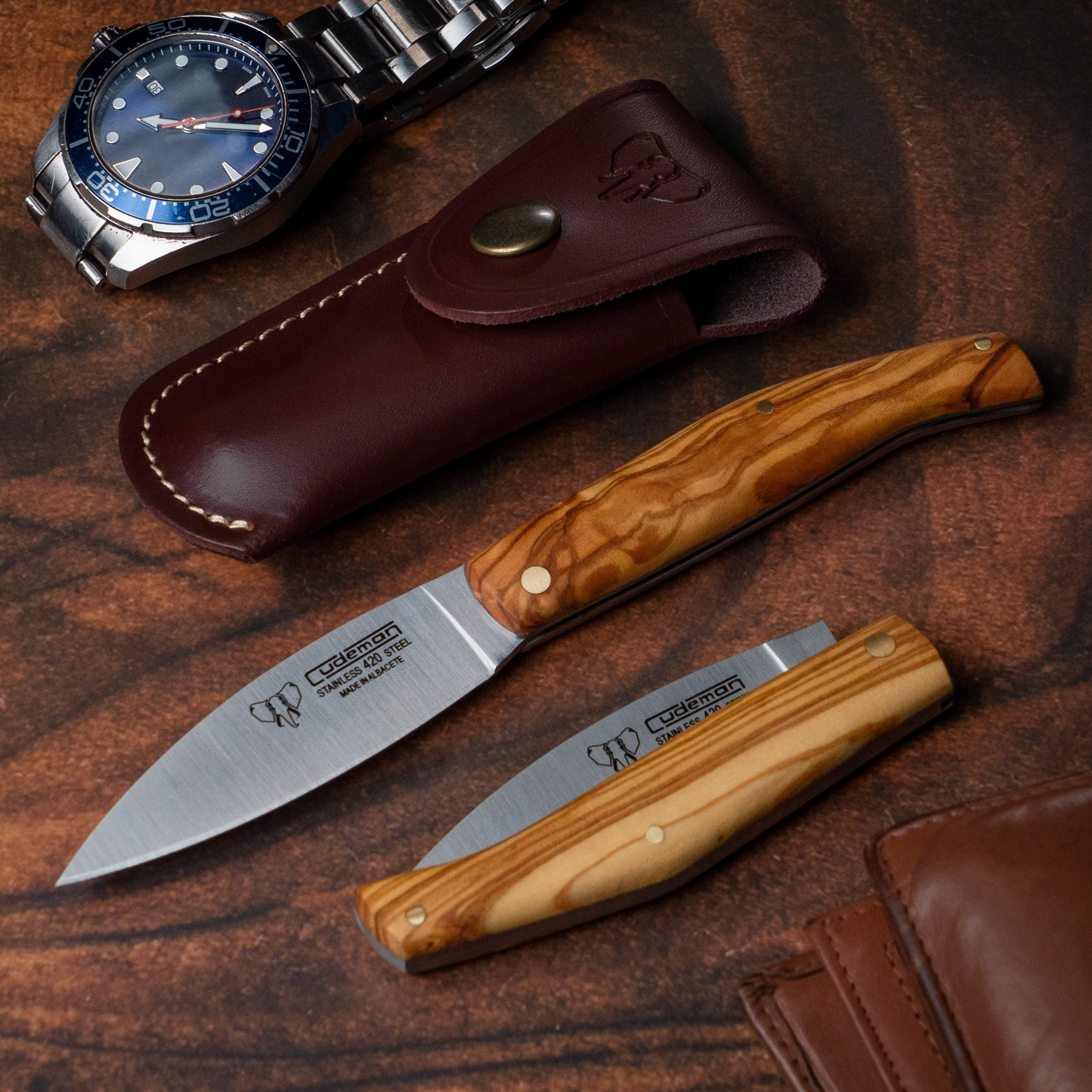 O sistema de fechamento por pistão garante um travamento seguro e fácil, proporcionando a tranquilidade que você precisa em cada movimento. A fixação do cabo por meio de latão fiel garante uma solidez excepcional, permitindo manusear a faca com confiança e precisão. Além disso, o cabo de oliva natural escovado acetinado não só confere um visual elegante e único, mas também oferece uma pegada confortável e ergonômica para um manuseio ideal em qualquer situação.