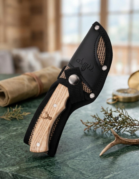 Esta faca não é apenas uma ferramenta, é uma declaração, um convite para elevar seu desempenho e experimentar aquela sensação de controle absoluto. Cada linha e cada detalhe de seu design, desde a curva da lâmina até o gravado do cervo no cabo, estão pensados para potencializar sua confiança em campo. Além disso, a capa de nylon de alta densidade e couro protege seu investimento, facilitando um transporte seguro e discreto. É seu aliado em cada desafio, pronto para acompanhá-lo na aventura com um estilo que reflete seu espírito de caça, seu desejo de excelência e seu caráter audacioso.