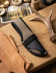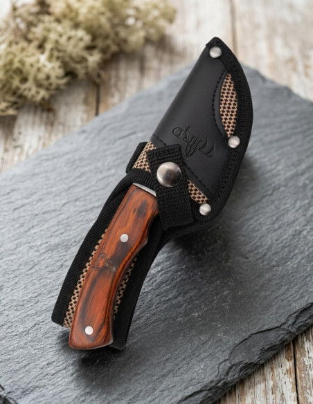 Esta não é apenas mais uma faca, mas um símbolo do seu compromisso com a excelência. O cabo em Pakkawood, com sua textura natural e design ergonômico, garante uma pegada firme e confortável, permitindo que cada tarefa seja realizada sem esforço. A bolsa de nylon de alta densidade e couro, robusta e segura, cuida do seu ato de caça em cada passo, oferecendo proteção sem sacrificar rapidez ou acessibilidade. A relação entre a lâmina, o peso e a ergonomia é projetada para que cada corte seja preciso, cada movimento, uma extensão de sua vontade, cada saída, uma oportunidade para reafirmar quem você é no campo. Com esta ferramenta em mãos, você se torna um caçador moderno que funde tradição e tecnologia, controle e paixão, em um único ato de conquista.