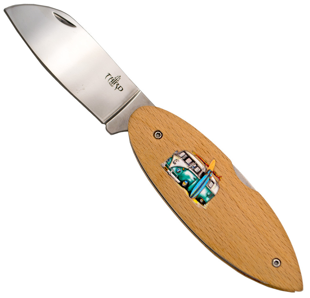 O cabo, em madeira de faia, confere um toque natural e robusto à faca. O que distingue o modelo Furgo M2 é a impressão de uma carrinha em ambos os lados do puxador, proporcionando um design único e personalizado que realça o seu carácter. Este detalhe não só acrescenta um toque estético distinto, mas também proporciona uma aderência confortável e segura para uso prolongado.