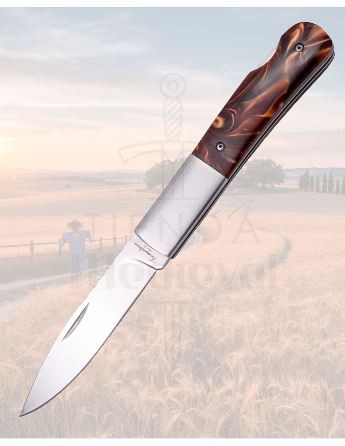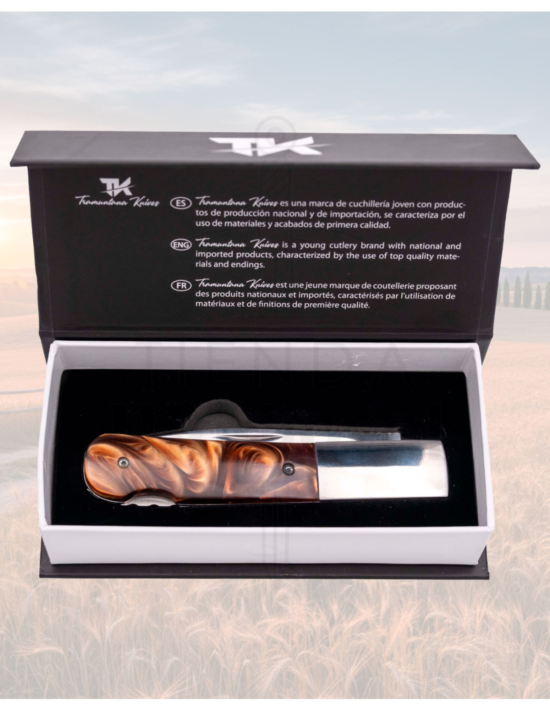 Projetada para aqueles que valorizam o equilíbrio entre estética e funcionamento, a Faca Tramuntana 10,2 cm, VG10 e bloqueio traseiro oferece manuseio preciso e confortável graças ao seu cabo com veios quentes que imitam a madeira, acabamento em acrílico âmbar e rebites visíveis que transmitem solidez. O cabo em aço polido oferece um contraste elegante e facilita o apoio dos dedos, para cortes controlados sem esforço.