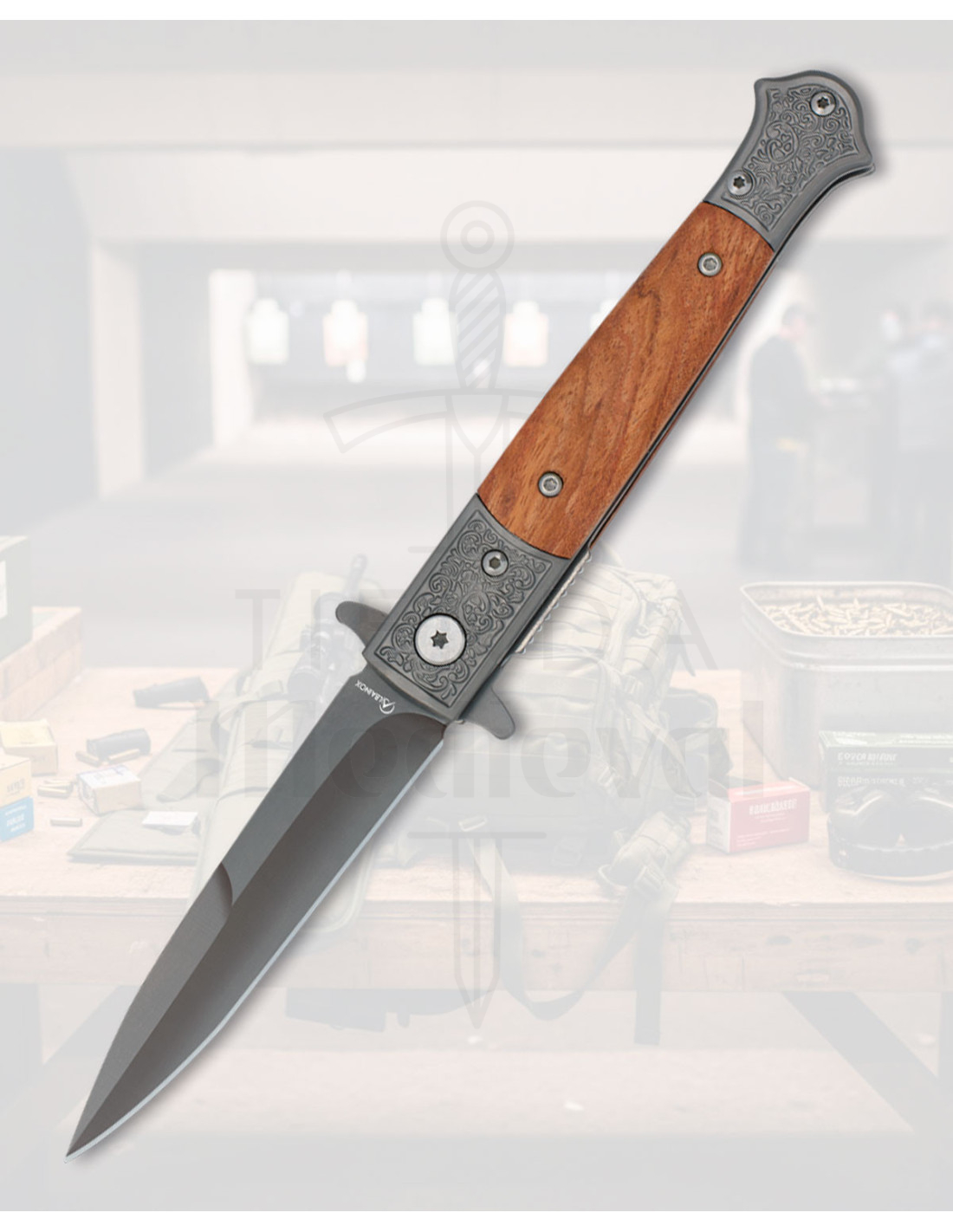 O acabamento fosco da lâmina e sua ponta biselada não apenas oferecem uma estética sóbria, mas se traduzem em cortes precisos e sem reflexos incômodos, perfeitos quando você precisa de discrição e eficácia. O detalhe mecanizado na base da lâmina com parafuso visível e relevo ornamental traz caráter, além de mostrar uma construção cuidadosa que fala de durabilidade e estilo.