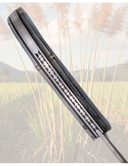 Graças ao mecanismo de dupla pistão e ao mola decorada, a abertura é suave e segura, e os rebites visíveis reforçam a conexão entre cabo e lâmina, transmitindo confiança em cada uso. É um facão dobrável pensado para acompanhá-lo com discrição, fácil de transportar e de abrir quando necessário.
