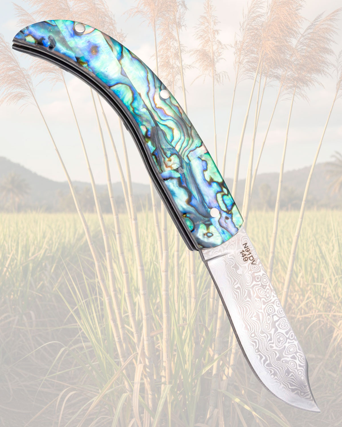 O Facão Rústico Tramuntana Knives com cabo de abalone e resina oferece esse momento: um cabo curvo, ergonômico, com um acabamento iridescente que lembra uma concha, mostrando azuis, verdes e roxos que mudam conforme a luz, para aqueles que valorizam o belo e o funcional.