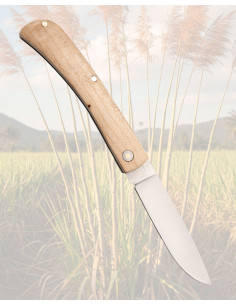 Seu tamanho compacto e peso leve a tornam especialmente portátil, perfeita para aqueles que valorizam a funcionalidade sem abrir mão do estilo. O contraste entre a madeira clara do cabo e o brilho metálico da lâmina cria uma aparência cuidada e versátil, apropriada tanto para saídas ao campo quanto para o uso diário.