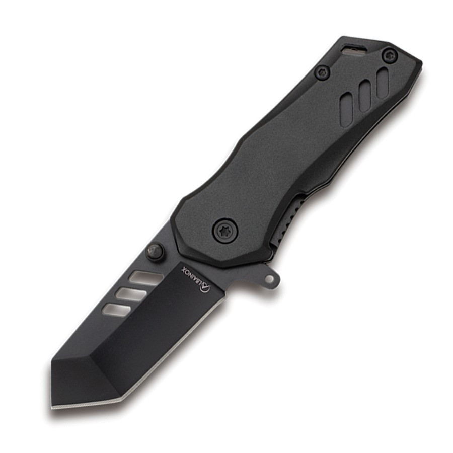 A lâmina da faca tática K-25 é feita de aço inoxidável 7Cr13MoV, um material muito resistente e durável. A lâmina também possui acabamento acetinado que a torna elegante e sofisticada. O cabo da navalha é feito de alumínio preto, um material leve e durável. A alça também é projetada ergonomicamente para proporcionar uma pegada confortável e segura.