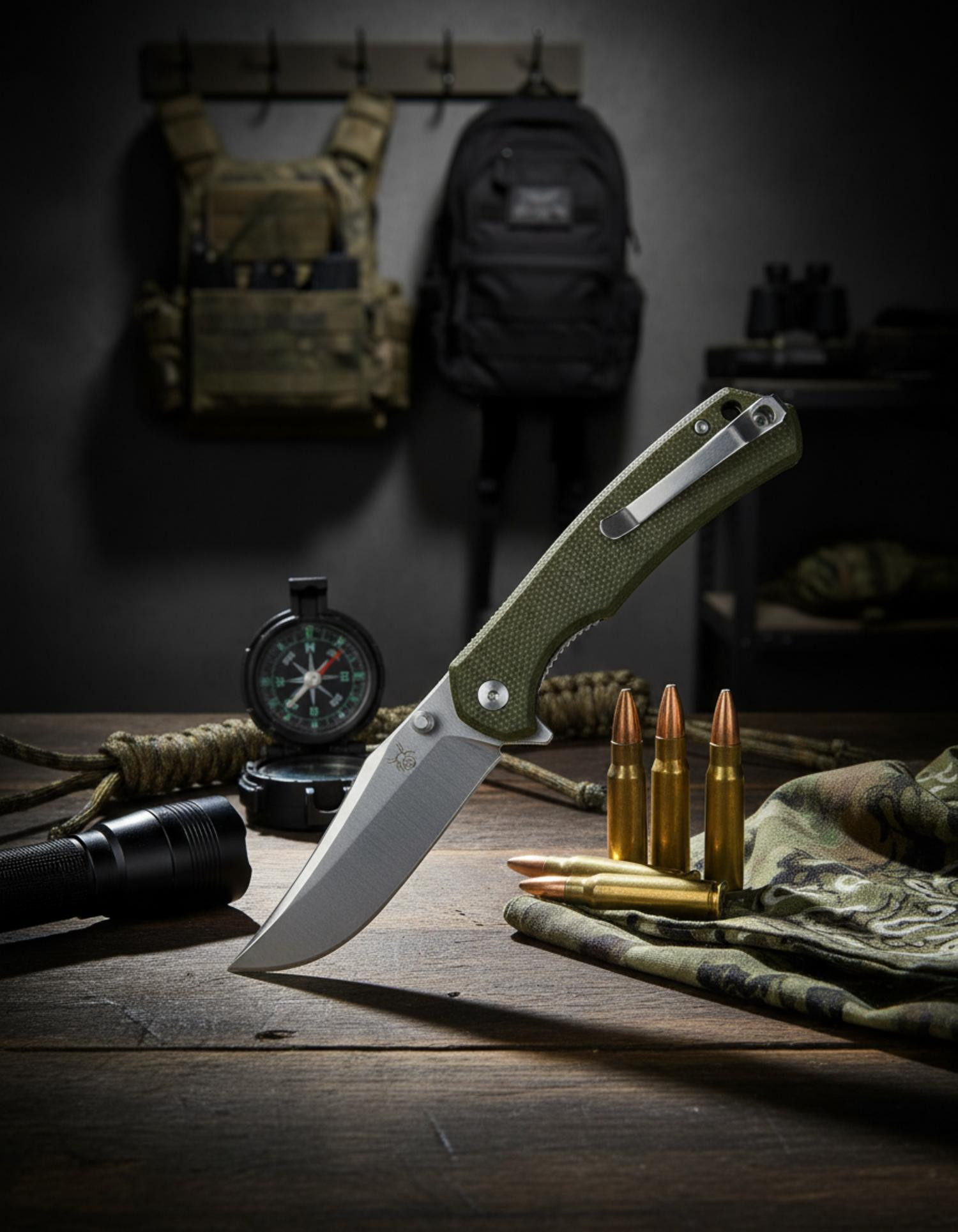 Você quer comprar a Faca tática D2 com cabos de Micarta verde e sentir a diferença? Seu design dobrável e o saliente metálico para abertura facilitam a operação com uma mão, perfeito para quem valoriza a praticidade sem abrir mão da robustez.