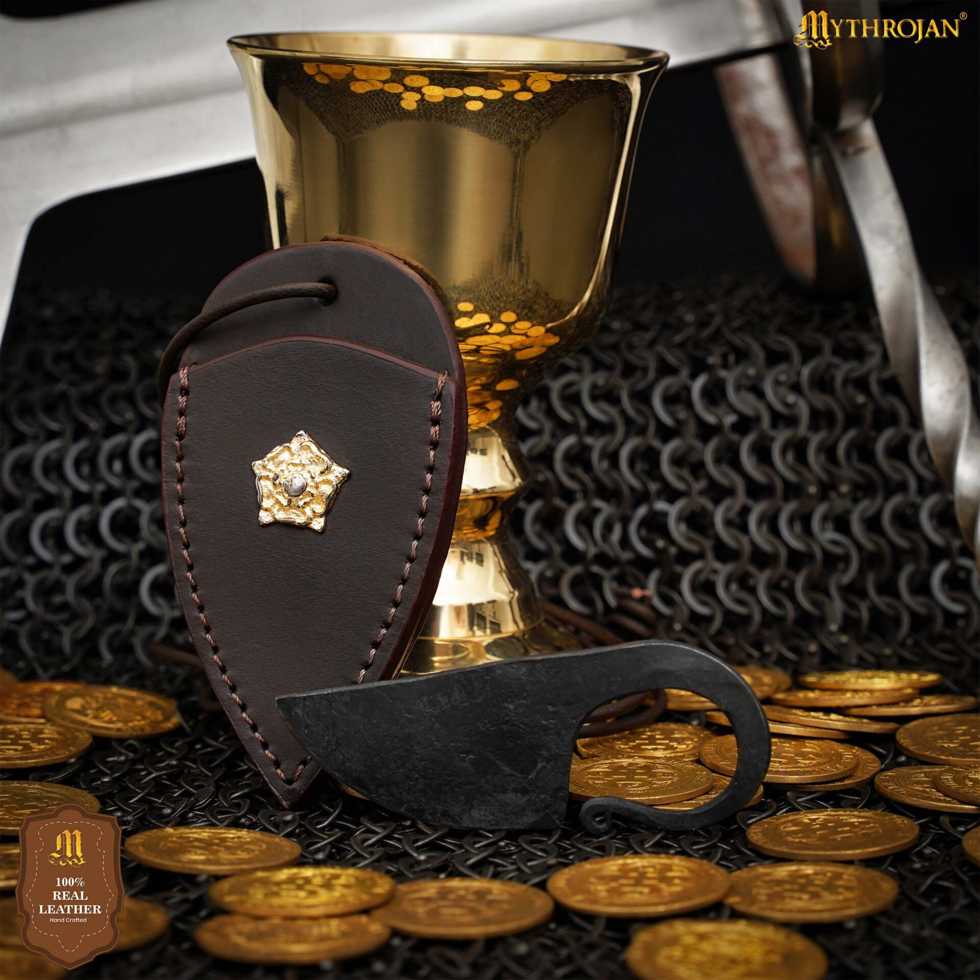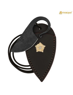A bainha, trabalhada em couro 100% genuíno, tingida e costurada à mão, envolve a peça com proteção e estilo. Sua silhueta em forma de escudo, com costuras visíveis que realçam sua construção, incorpora um adorno metálico hexagonal em relevo e um chamativo emblema de leão dourado, símbolos de honra e presença que elevam qualquer traje ou exibição. O cordão de couro permite usá-la no pescoço ou fixá-la ao cinto, oferecendo versatilidade e conforto sem renunciar à porte tradicional.