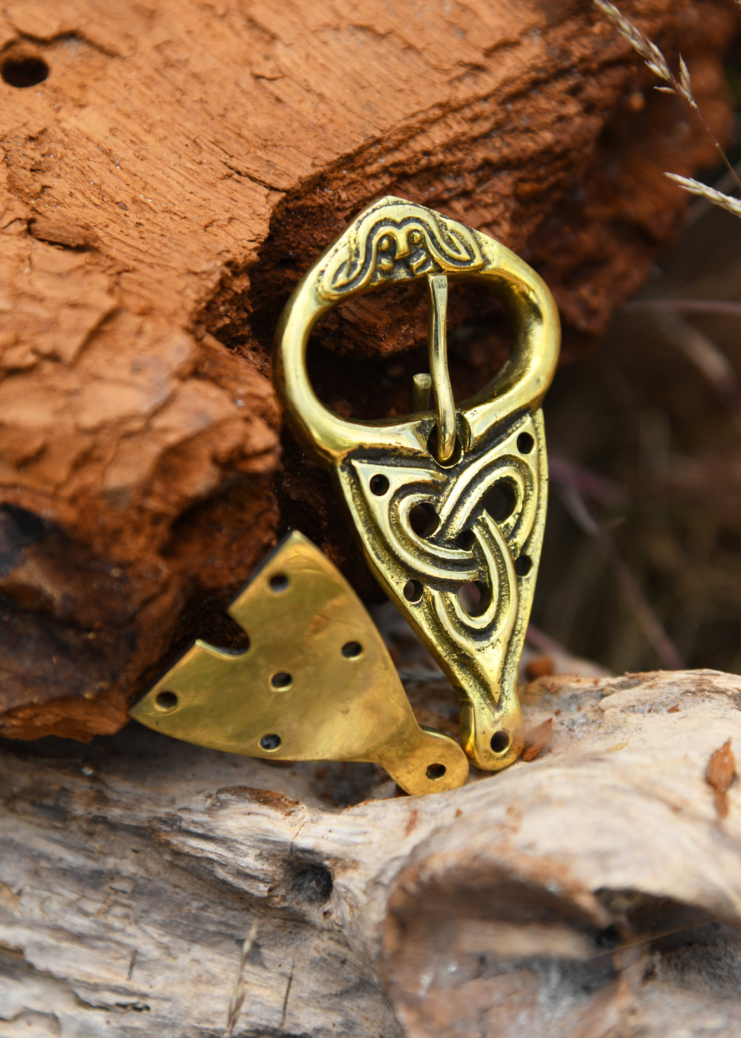 A peça, feita em bronze de alta qualidade, não só oferece resistência, mas também aquele acabamento dourado que confere um toque vintage e nobre, ideal para acessórios de inspiração celta ou viking. A fivela mede aproximadamente 66 x 39 mm, tamanho perfeito para cintos de até 29 mm de largura, oferecendo um equilíbrio entre presença e conforto.