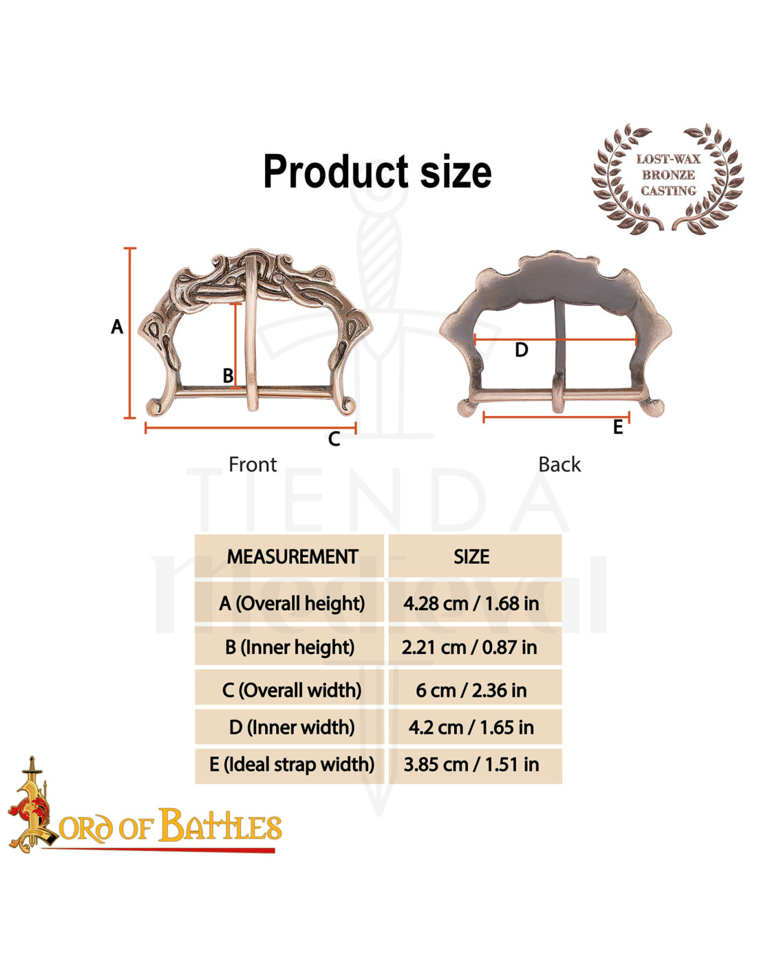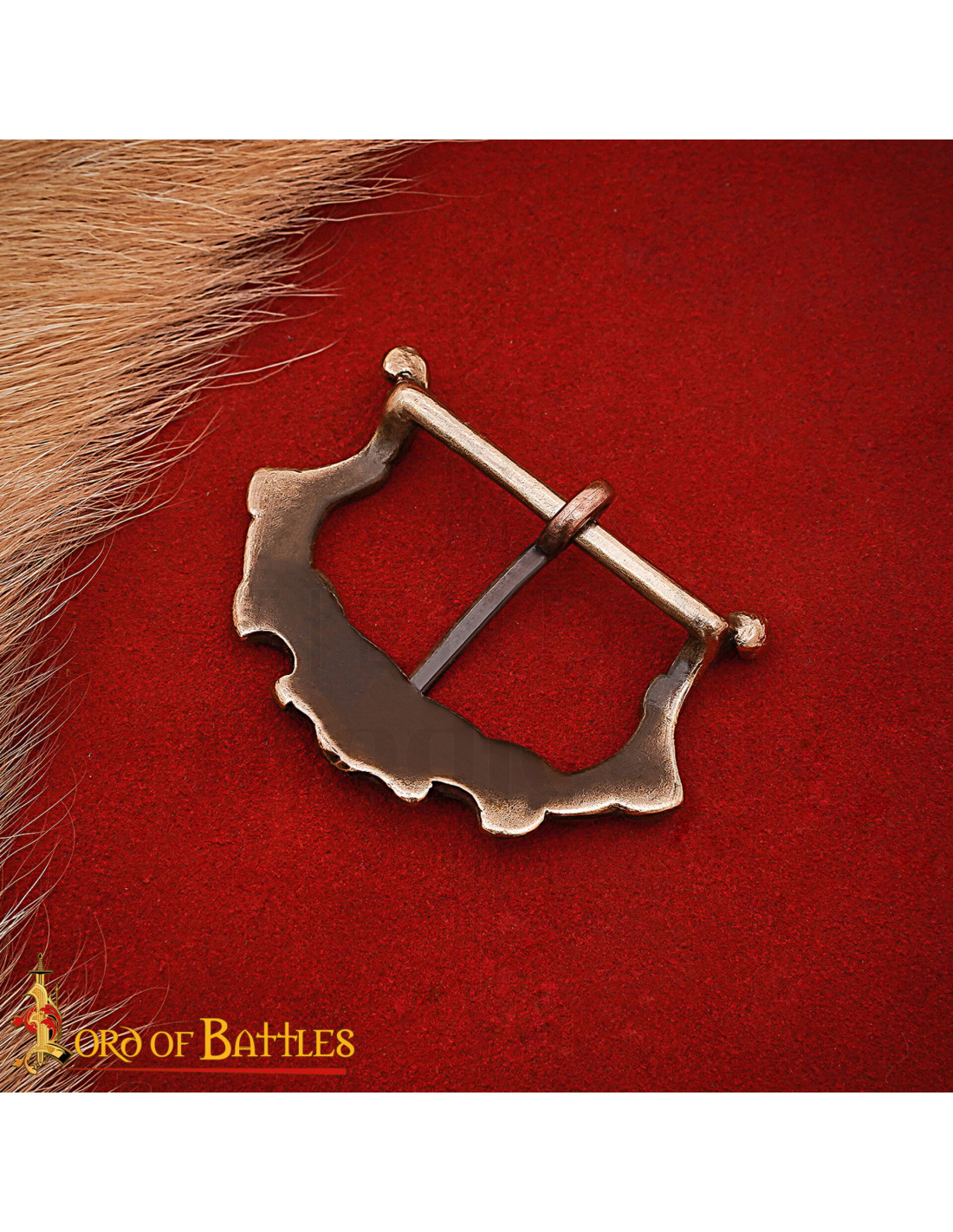 Fabricada manualmente em bronze sólido pelo processo de cera perdida, cada fivela garante detalhes precisos e durabilidade. Seu acabamento em bronze envelhecido confere um ar de antiguidade, como se carregasse séculos de história, enquanto a opção com brilho polido oferece uma aparência mais vibrante e renovada. Ideal para construir ou restaurar cintos históricos, aprimorar seu equipamento de LARP ou completar seus projetos de couro com um toque autêntico e distinto.