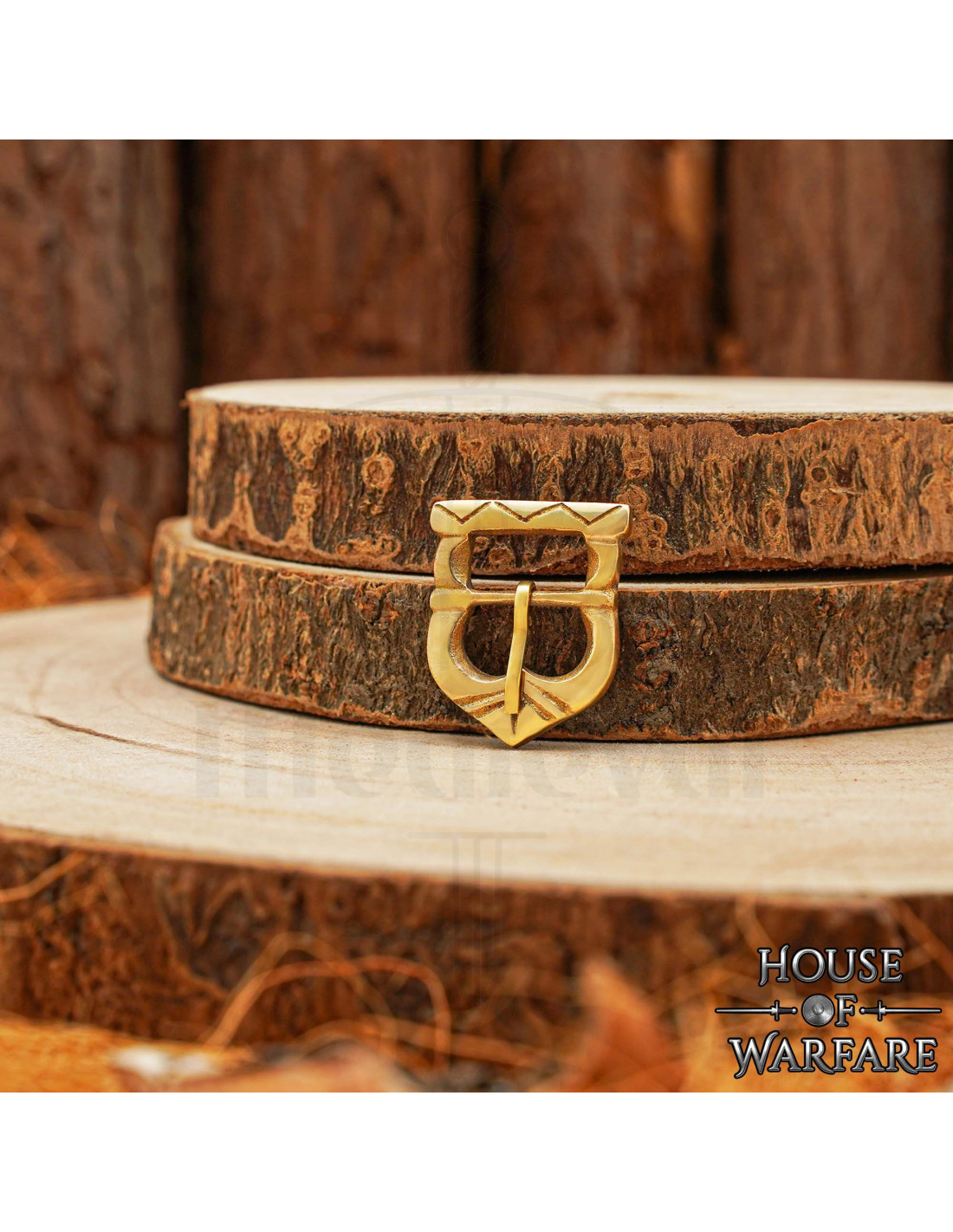 Inspirada em desenhos dos períodos viking e normando do século IX ao XIII, apresenta um gravado geométrico em zigue-zague que acrescenta autenticidade sem ostentação, ideal para aqueles que buscam recriações fiéis e acabamentos com caráter. Seu tom dourado quente realça o couro e os tecidos, proporcionando aquele aspecto vivido que distingue um conjunto autêntico do restante.