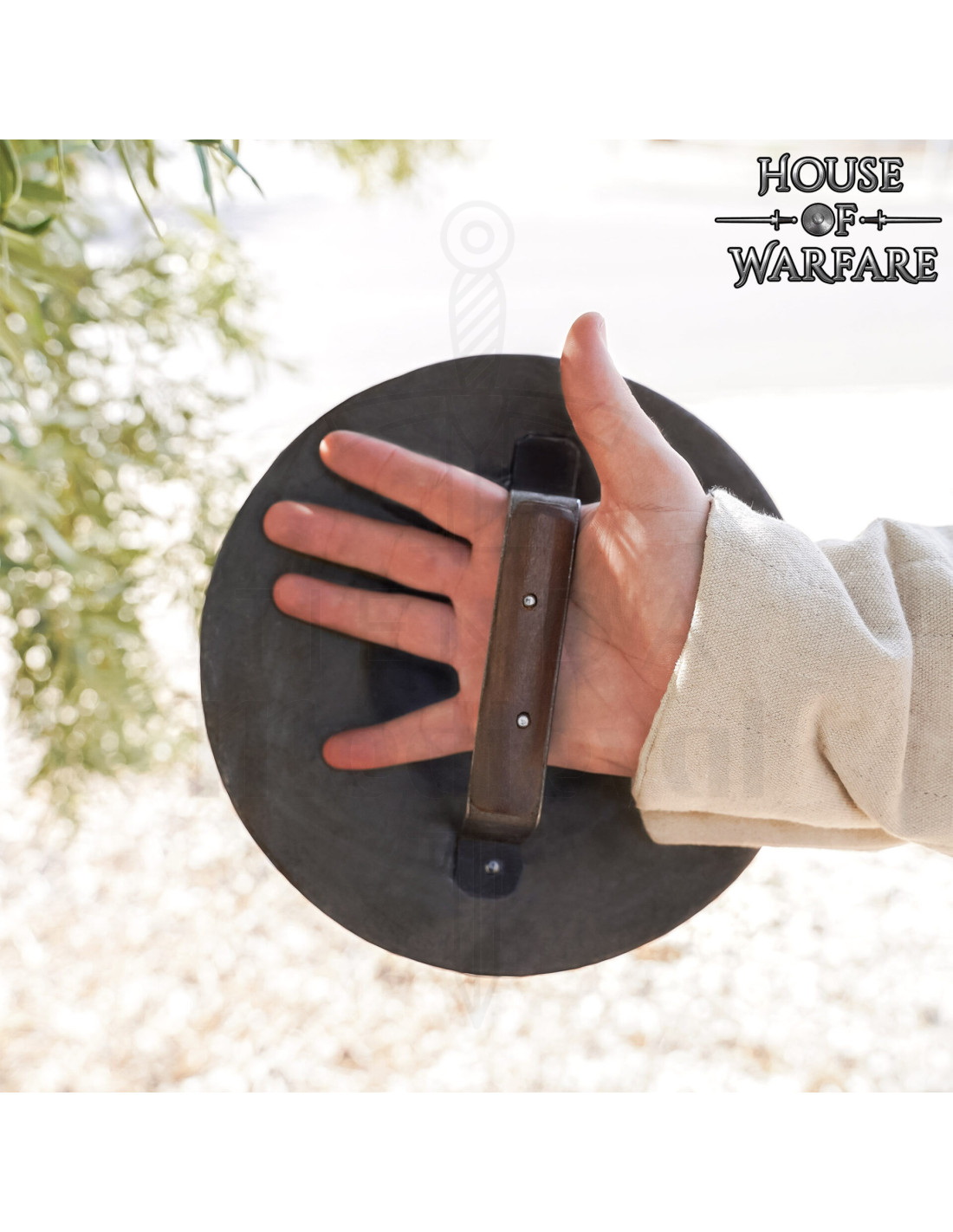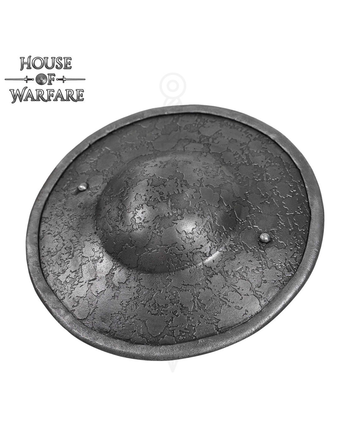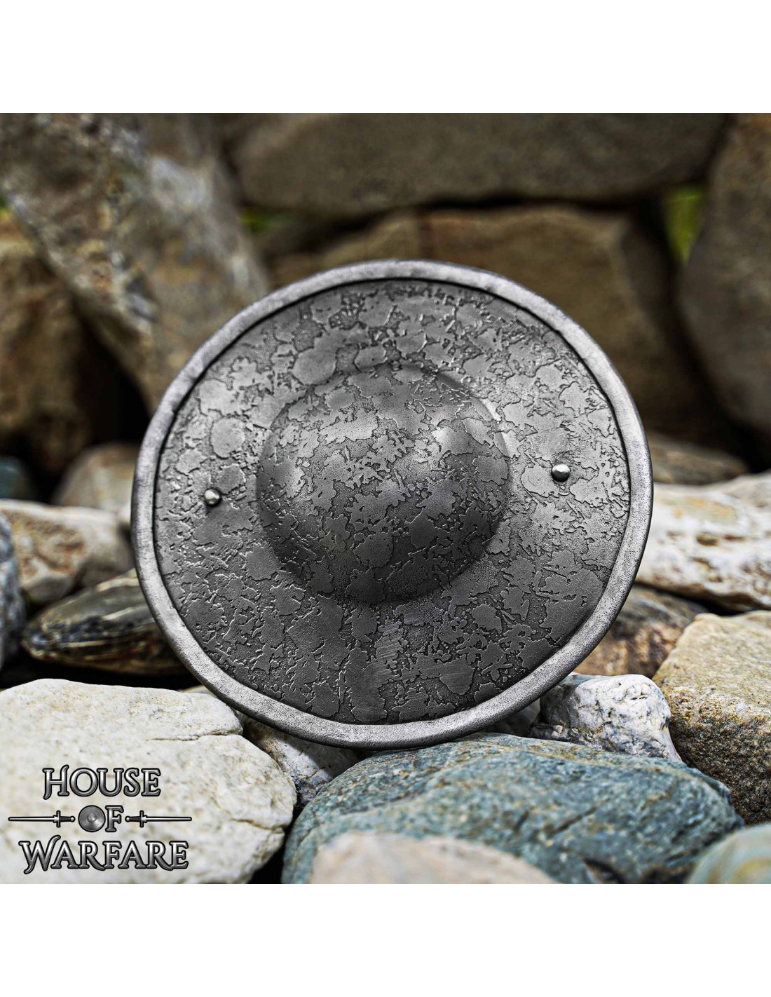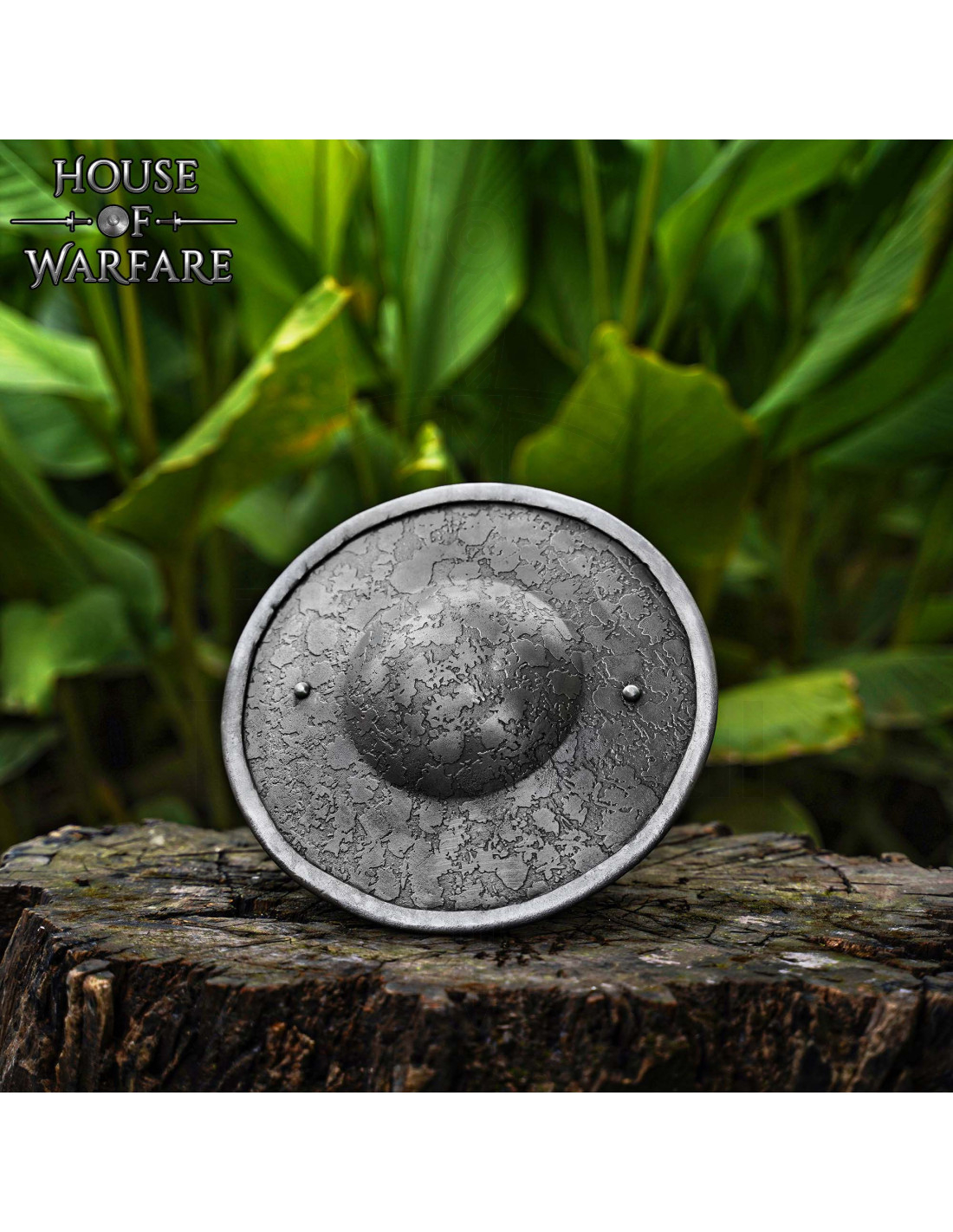 Este broquel, forjado em aço com acabamento envelhecido e textura natural, oferece uma aparência rústica que se destaca sem necessidade de pinturas. Sua superfície irregular e o cinza metálico evocam o desgaste real da batalha, enquanto a protuberância central, bem marcada, desvia os impactos e protege a mão nos encontros mais próximos. A borda levemente elevada reforça a estrutura, oferecendo uma sensação de solidez ao bloquear e redirecionar golpes.