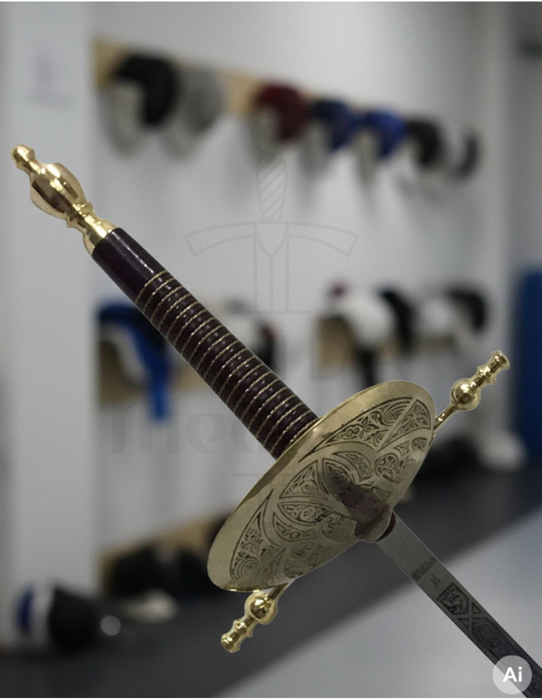 Fabricado artesanalmente em Toledo, Espanha por o mestre espadeiro José Luis Rubio, este florete representa a qualidade e a tradição.